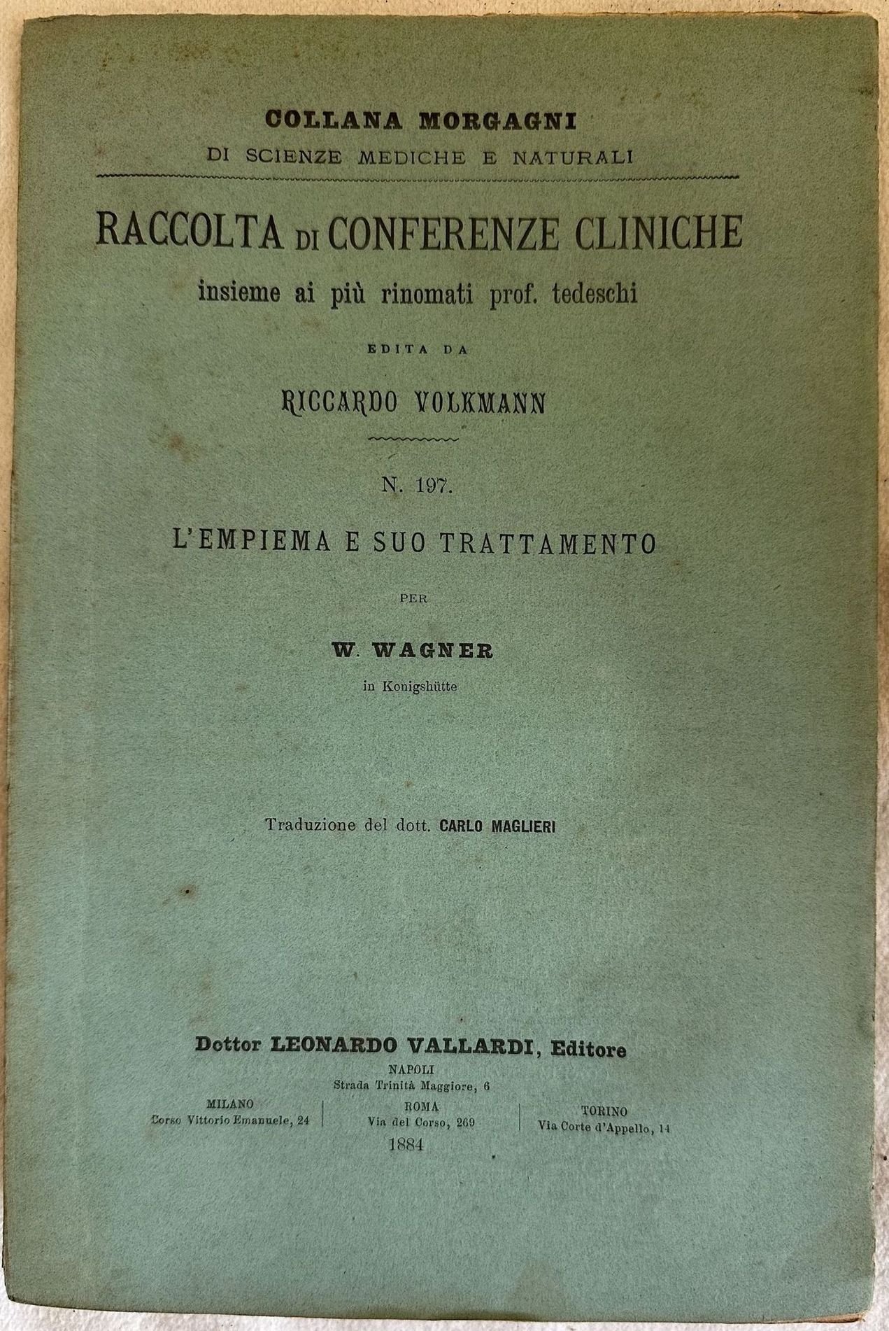 Interessante pubblicazione del 1884 sull'empiema e suo trattamento di W. Wagner. Fascicolo della Collana Morgagni di scienze mediche e naturali. Traduzione del Dott. Carlo Maglieri In ottime condizioni. Copertina editoriale in ottime condizioni generali con lievi usure ai margini e dorso. Legatura in buone condizioni. Pagine in ottime condizioni con rare fioriture. In 8. cm. 25x16,5. Pp. 2347-2384.Interesting pamphlet of 1884 about empiema and its treatment by W. Wagner. Pamphlet of Collana Morgagni of natural and medical science. Translation by Dott. Carlo Maglieri. In very good conditions. Editorial cover in very good conditions lightly worn in the extremities. Binding in good conditions. Pages in very good conditions with occasional foxing. In 8. cm. 25x16,5. Pp. 2347-2384.<BR><BR>