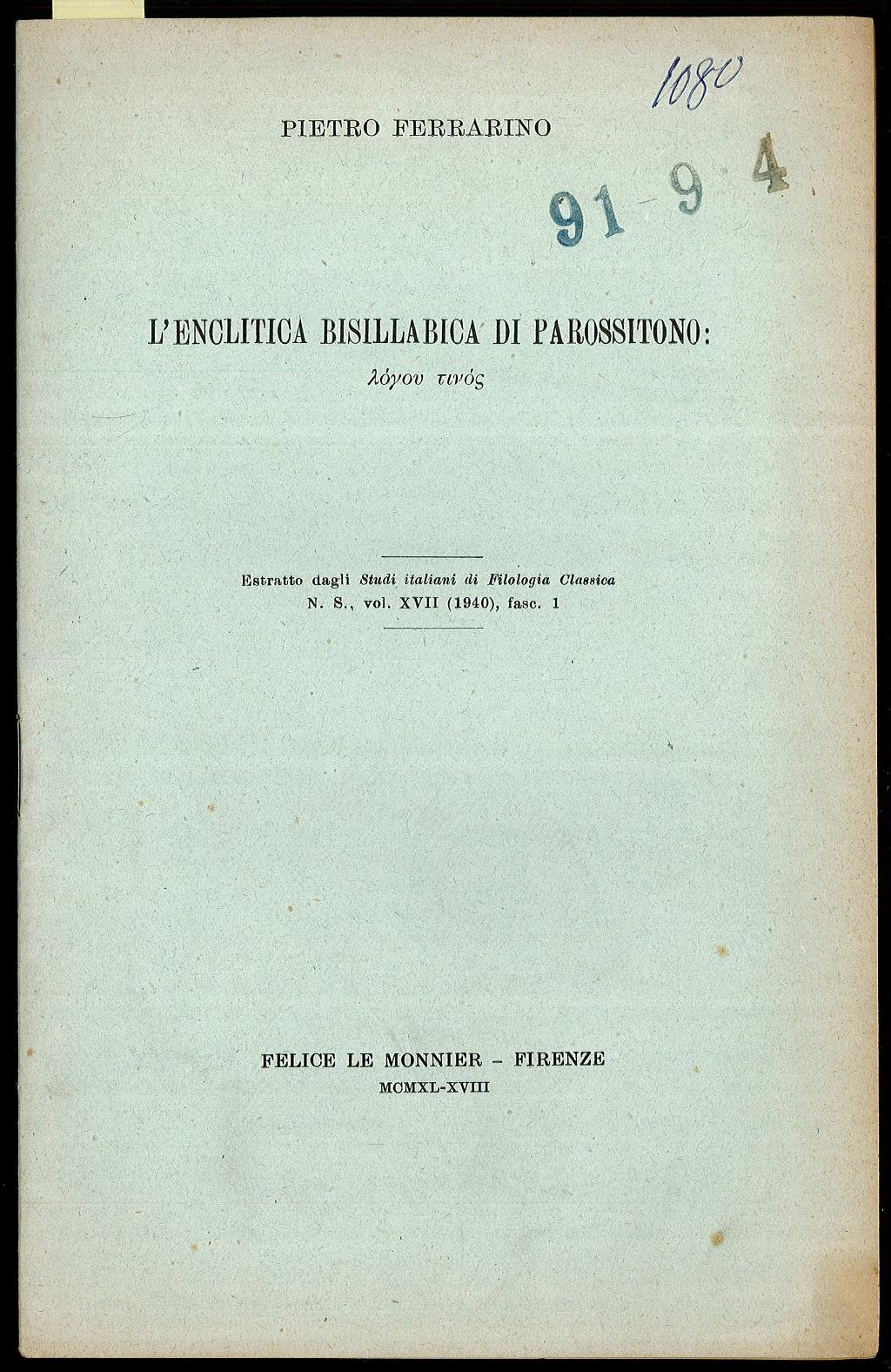 Opuscolo vintage. Estratto dagli Studi italiani di Filologia Classica N. S., vol. XVII (1940), fasc. 1. Usura da scaffale. Segno del tempo.