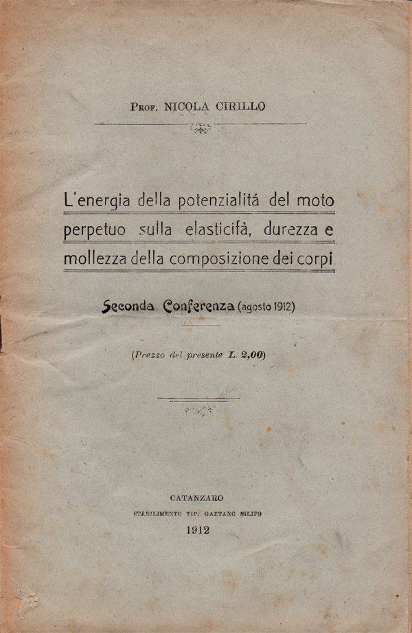 In-8° (24,4 x 15,9 cm), pp. 35, (1) (con numerazione da 35 a 69, più una bianca finale), copertina editoriale con tracce del tempo (vedi foto). Segno di piegatura trasversale centrale. Normale patina del tempo alle pagine, con leggere arrossature dovute al tipo di carta. Segno a matita blu nel margine esterno di pagina 36. L'opuscolo in questione, contenente curiose, quanto astruse teorie astronomiche e fisiche, venne inviato al direttore dell'Osservatorio Meteorologico di Livorno e quindi inoltrato presso la residenza di tal prof. Gragnani, a Francavilla a Mare: la copertina posteriore riporta infatti i due indirizzi, i francobolli (due da 2 centesimi) e due timbri postali dell'ufficio di Cardinale (Catanzaro) recanti la data 17 agosto 1912 (17 AGO 12). In questa sua seconda "conferenza", l'autore esordisce con le seguenti rivelazioni: "Il meraviglioso Macchinario elettrico Universale è composto di due corpi elettrici. Il primo è trasparente, il quale vorticosamente produce il giorno e la luce che chiamasi volgarmente sole; l'altro secondo corpo è Opaco e con lo stesso vortice produce la notte. Sul corpo Opaco si compone quella rifrazione di luce che volgarmente chiamasi luna e le sue fasi - Oggi la credenza degli Astronomi è tale, e questa falsa credenza è in tutto il mondo - invece gli eclissi sono prodotti dai due corpi atmosferici elettrici, e non già dal sole, e dalla luna, poiché questi due corpi non esistono". Così la nota posta in chiusura dello scritto: "Il professore Nicola Cirillo di Cardinale - Calabria - non vive di fondi secreti: non ha cattedre retribuite: non è stato mandato ancora ad alcuno osservatorio. La sua scienza è frutto del suo ardore, e per raccoglierla in fascicoli ed irradiarla nel mondo scientifico, egli fece e sta facendo dei grandi sacrifici. Per tanto tutti coloro che hanno trattenuto ed altri vanno trattenendo il sommario e la prima conferenza, e questa seconda, sono pregati rimettergli il tenue prezzo d'abbonamento di L. 5,00".