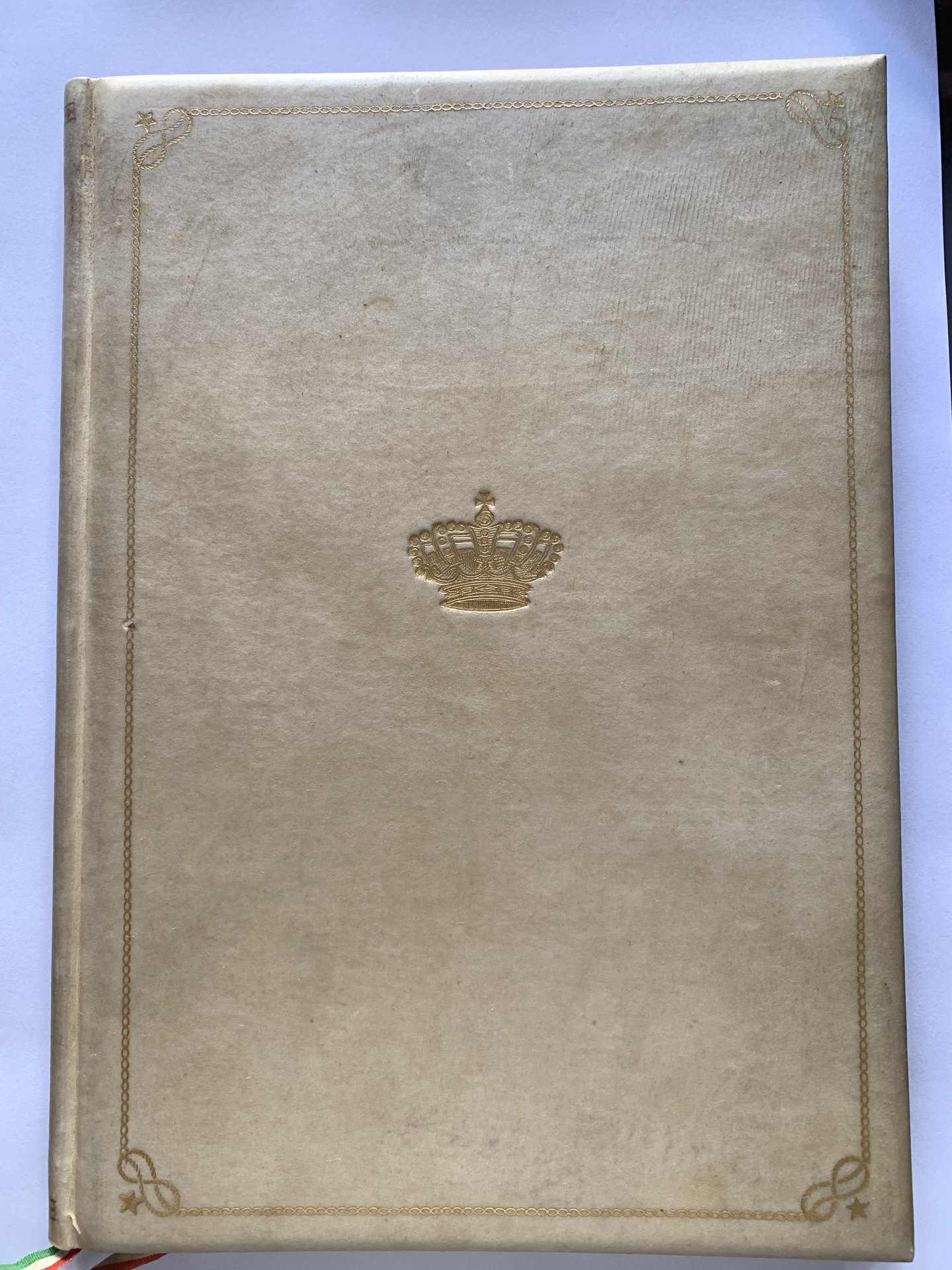 >in-8 (mm. 235x160), pp.59 con varie llustrazioni. Legatura originale rigida in tutta pergamena, filetti ed emblemi Sabaudi sui piatti, corona al centro di quello anteriore. Perfetto esemplare, proveniente dalla biblioteca del Re Vittorio Emanuele III di Savoia.
