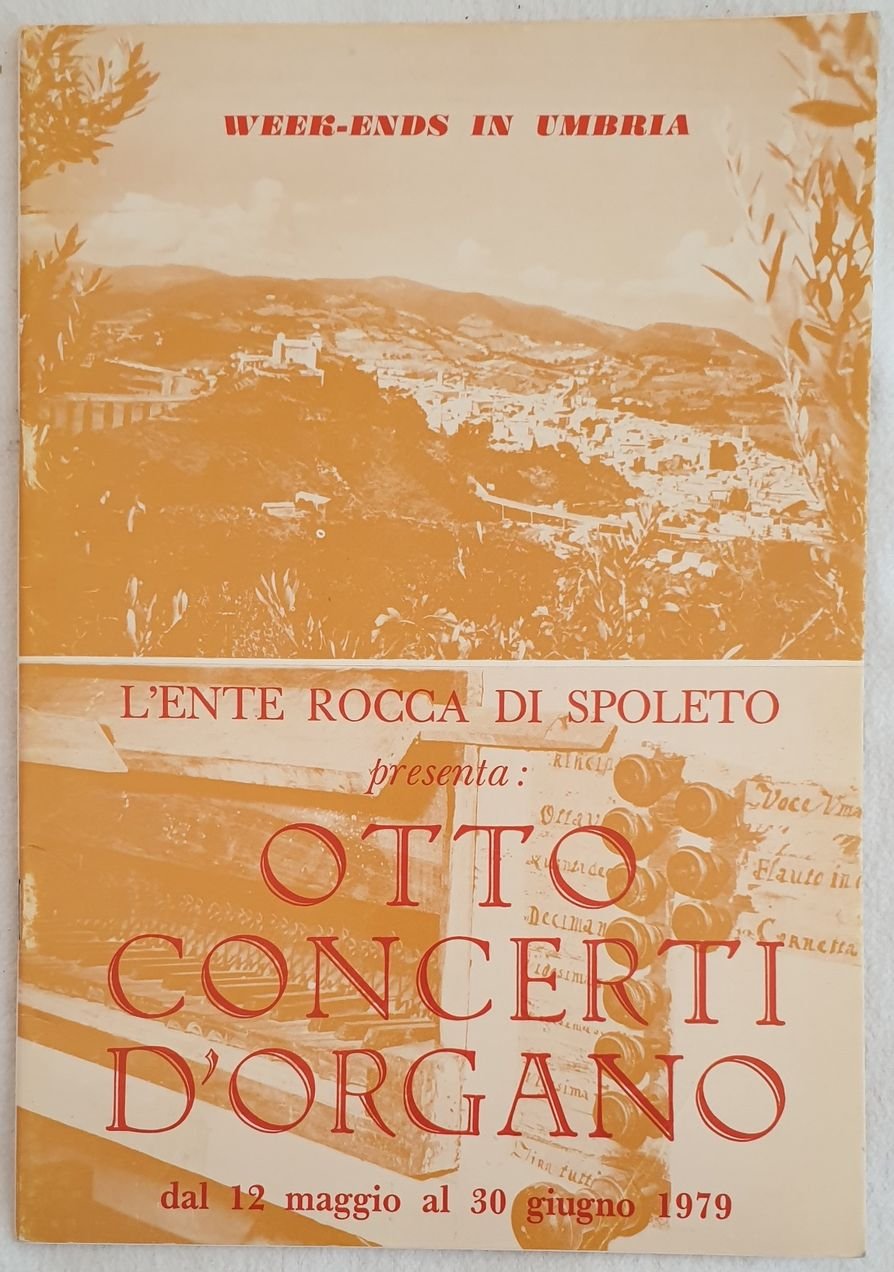 Programma di "otto concerti d'organo" dell'Ente Rocca di Spoleto dal 12 maggio al 30 giugno 1979. In ottime condizioni. Copertina editoriale in ottime condizioni generali con lievi usure ai margini e dorso. Legatura in ottime condizioni. All'interno le pagine si presentano in ottime condizioni. Per un errore tipografico il corpo del volume è stato rilegato al contrario. In 8. Dim. 24x17 cm. Pp. 24.Programme of "otto concerti d'organo" of the Ente Rocca di Spoleto from 12th of may to 30th of june 1979. In very good conditions. Editorial cover in very good general conditions slightly worn in the edges and spine. Binding in very good conditions. Inside pages are in very good conditions. For a typographycal fault the body fo the volume has been bound in reverse. In 8. Dim. 24x17 cm. Pp. 24.