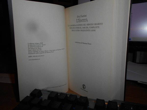 ERIC FRATTINI. Roma, Fazi Editore, 2008. L' Entità. La clamorosa scoperta del servizio segreto vaticano: intrighi, omicidi, complotti degli ultimi cinquecento anni. In-8° piccolo, cartoncino edit. ill. a col. con risvolti. x, 524, (2) pp. con numerose illustrazioni in bianco e nero in tavole fuori testo. Come nuovo. Neg. mob. rosso