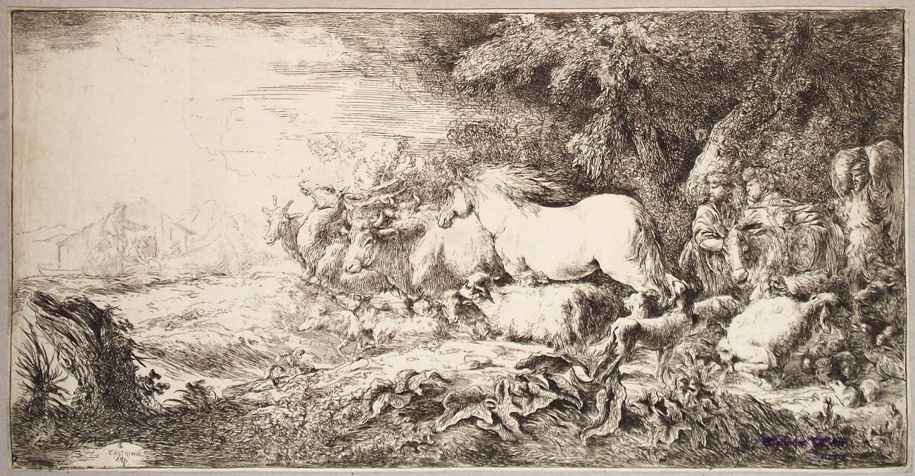 >Acquaforte mm. 203x400. Si tratta di uno dei soggetti preferiti da Castiglione, l'entrata degli animali nell'Arca, la tecnica acquafortista raggiunge qui il massimo della raffinatezza. In questa composizione sviluppa il tema accennato nell'incisione : "Noè che fa entrare gli animali nell'Arca" (1630 ca.). Il tema biblico è accennato nella parte sinistra del rame in primo piano gli animali. Le opere attribuibili al primo periodo di attività genovese (L'entrata degli animali nell'arca, Genova, Accademia Ligustica; Noè fa entrare gli animali nell'arca, Firenze, Gall. degli Uffizi, inv. 1336; per le molte versioni, vedi Meloni) mostrano il C. attento soprattutto alla tradizione di pittura animalistica - rappresentata a Genova da parecchie opere dei Bassano e dall'attivo gruppo fiammingo facente capo ai fratelli de Wael e a Jan Roos - ed estremamente vicino, nell'impianto delle scene e nel taglio compositivo, alla pittura dello Scorza (di quest'ultimo vedere soprattutto Noè che accoglie gli animali nell'arca, firmato e datato 1630, Genova, Gall. di palazzo Spinola). Bell'esemplare con margini sottili e piccolo timbro di collezione visibile in basso a destra. Bartsch vol. 46 n. 1.