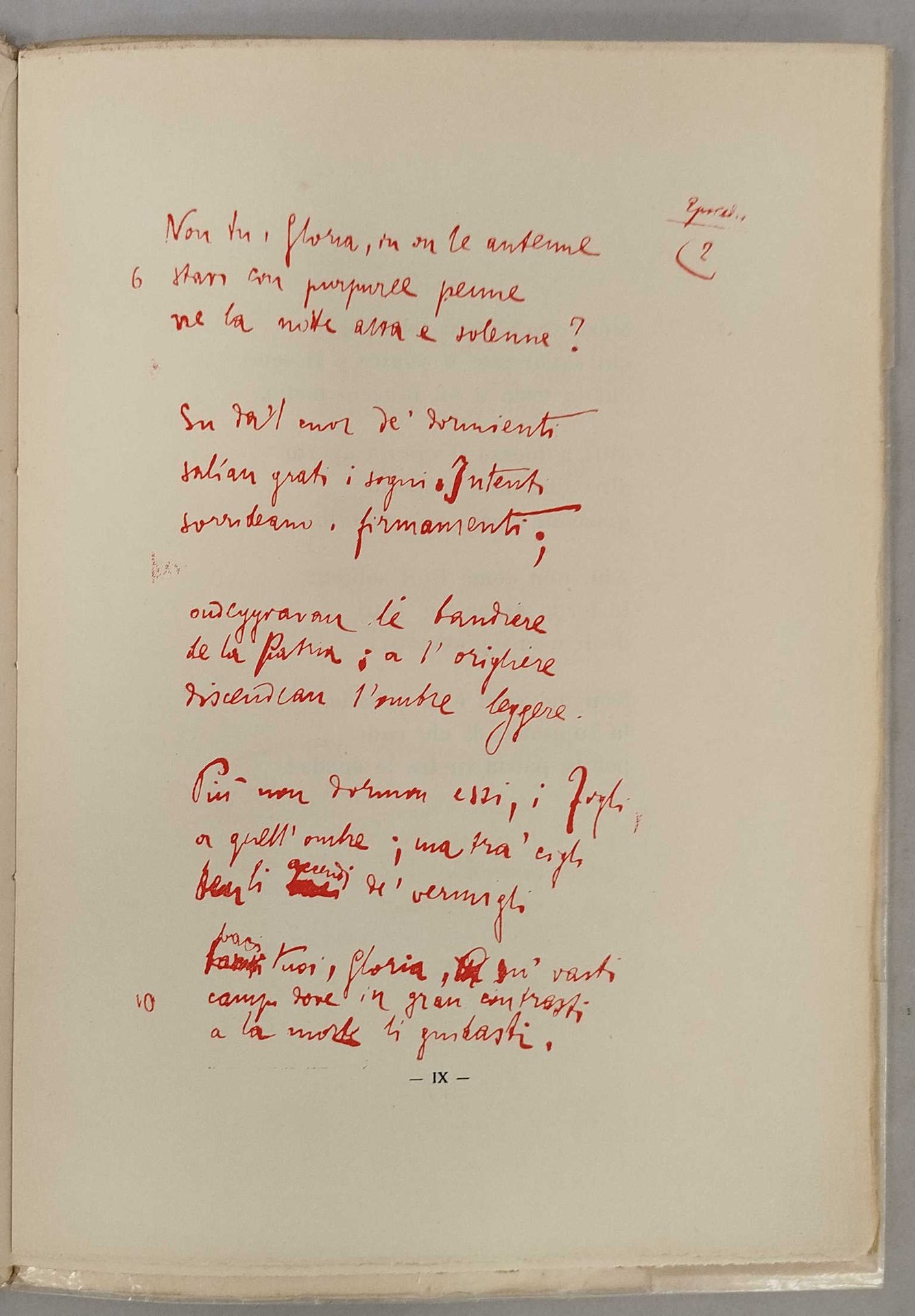 Esemplare in buone condizioni.Brossura editoriale con titoli al piatto anteriore; sovraccoperta ripiegata in acetato trasparente brunita con segni di usura ai bordi. Minuscola etichetta adesiva riportante il numero 257 al risvolto posteriore della copertina.Tagli irregolari; tagli di testa chiusi.Carte lievemente brunite, ben conservate con ampi margini. Alle carte dispari facsimile di autografo di D'Annunzio color rosso.Testo in Lingua Italiana.