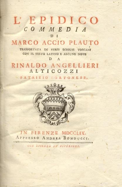 L'EPIDICO. Commedia trasportata in versi sciolti toscani con il testo latino e alcune note da Rinaldo Angellieri Alticozzi, Patrizio Cortonese.