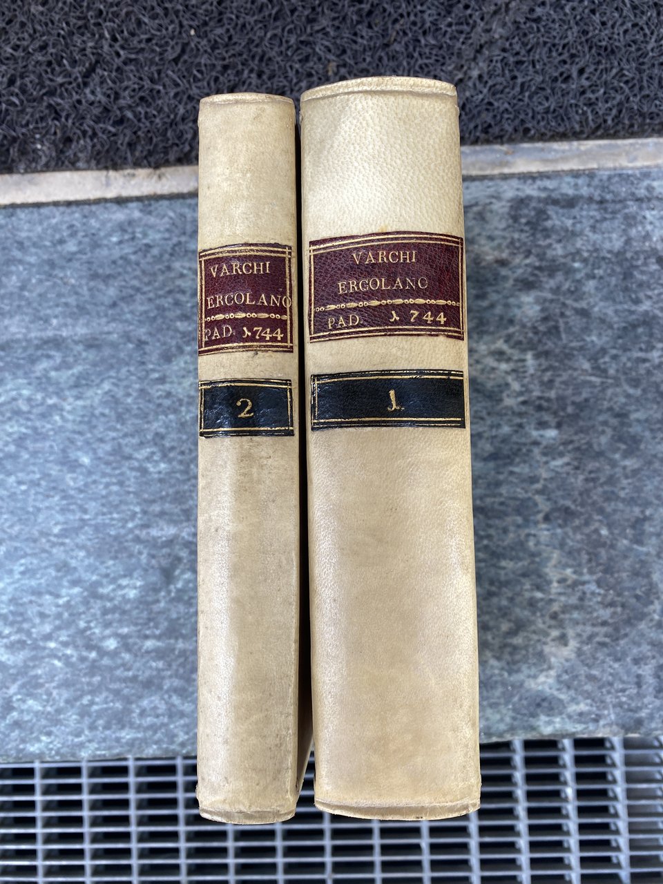 Due volumi, in -16, pp. XII, 570, (2); il secondo tomo è diviso in due parti pp. 130, 170, (14), legature pressochè perfette in tutta pergamena con tasselli al dorso, tagli rossi, marca tipografica al frontespizio e alla fine delle varie parti, nella guardia del primo volume si trova un commento manoscritto, datato 1827, pagine candide e condizioni molto buone.