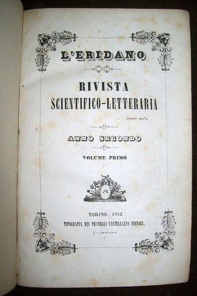 2 parti in un volume in 8°, pp. 480, 480. Leg. dell’epoca mezza pelle. Dorso liscio con titoli e filetti oro. Numerazione di tomo (1 ?). Seconda annata. Buon esemplare, con rare fioriture. Dell’Eridano, rivista scientifico-letteraria di intonazione riformistico - moderata vennero pubblicate solamente le due annate 1841 e 1842. Tra i vari articoli: Voyage en Sardaigne par le comte de La Marmora di Gustavo Avogadro; Le Osservazioni sulle strade in ferro progettate nel Piemonte, di Luigi Rocca.