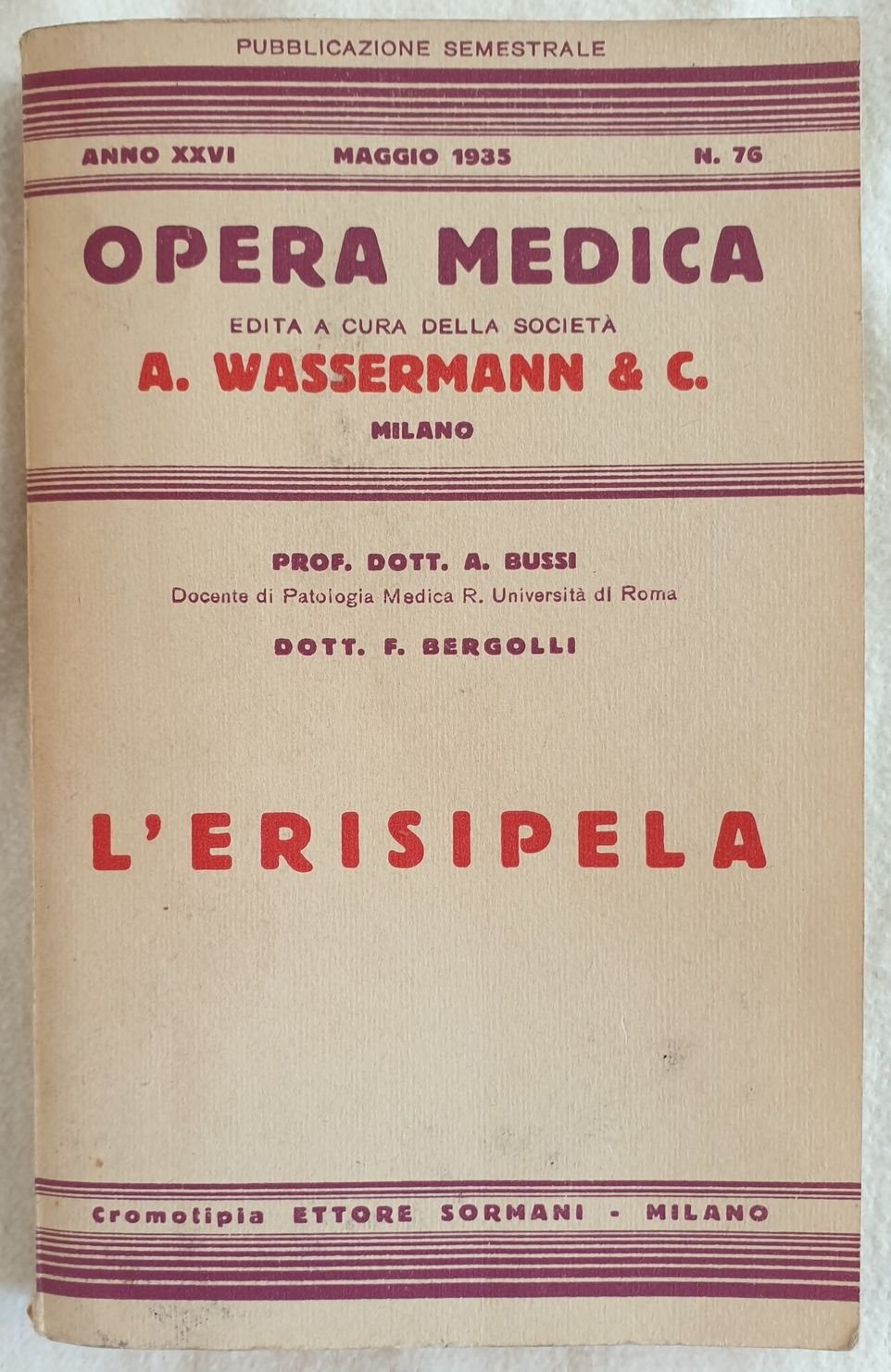 Edizione del 1935 di questa pubblicazione sull'erispela di A. Bussi e F. Bergolli della collana Wassermann. In ottime condizioni. Copertina editoriale in ottime condizioni generali con lievi usure ai margini e dorso. Legatura in buone condizioni. All'interno le pagine si presentano in ottime condizioni. In 16. Dim. 18x11,5 cm. Pp. 288. Edition of 1935 of this pamphlet of Egypt by A. Bussi e F. Bergolli of the series Wassermann. In very good conditions. Editorial cover in very good conditions slightly worn in the edges and spine. Binding in good conditions. Inside pages are in very good conditions. In 16. Dim. 18x11,5 cm. Pp. 288.