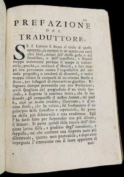 In 4°; XII, 210, (2) pp. Legatura coeva con titolo e conrice in oro ai piatti, restaurata con rinforzo in pergamena sottostante. Antiche note di possesso privato al frontespizio ed alla prima carta anticamente cancellate e solo in parte leggibili: “Joseph Deserdelli (?), Luigi Colfaroni (?), Agostino Caproni (?)”. Una fine incisione al frontespizio. Un forellino di tarlo nel margine basso bianco, un secondo forellino, sempre nel margine bianco ed ininfluente, a partire da pagina 135, ambedue ininfluenti. Un'iniziale xilografica, una testatina animata finemente incisa da Gio. Lapi. Un piccolissimo strappetto nell'angolo esterno alto del frontespizio. Nel complesso in buone condizioni di conservazione. Prima traduzione italiana di questo curioso scritto apparso per la prima volta a Francoforte nel 1742 in lingua latina. L'opera venne poi tradotta in inglese da Jhon Campbell che vi apportò numerose aggiunte. La prima edizione italiana, di anonimo traduttore che si firma F. P., porta la dedicatoria al Conte Camillo Capponi. L'opera è un curioso e stravagante trattato che descrive il modo di prolungar la vita ben oltre i limiti naturali, tanto che alcuni autori, considerano la figura di Ermippo come uno dei primi vampiri mai descritti. L'autore compose l'opera in tono serio anche se probabilmente, l'intento era quello di metter in ridicolo voci popolari e racconti che in quel periodo erano ampiamente documentate in Slesia (si ricordi che la dissertazione sui vampiri di Calmet venne scritta nel 1740). Infatti considerando anche la regione geografica dell'autore, nato nelle vicinanze dei luoghi dove il mito dei vampiri esplose per primo in Europa, la Slesia, suggerisce come, Cohausen, prendendo spunto dai racconti (alcuni riportati dallo stesso autore), che circolavano nei territori della Slesia, di morti che ritornavano alle loro case ed uscivano dalle tombe per uccidere parenti o nemici, arrivi a riprendere e tratteggiare alcune caratteristiche del mito dei vampiri. Con similitudine con i vampiri, Ermippo, invecchiando non solo non muore ma aumenta il suo vigore fisico. Un altro chiaro riferimento al vampirismo, è ad esempio, il suggerimento di Cohausen di imbottigliare il fiato delle vergini per poterlo poi respirare, creando così una pozione miracolosa in grado di prolungare la vita e donare eterno vigore. Il legame fra vampirismo ed il succhiare il sangue, nelle voci che giravano fra gli abitanti della Slesia non legavano ancora, perlomeno in modo univoco, il vampiro al sangue. Il vampiro sembrava rubare il respiro o le energie dalle sua vittime, nutrendosi così del loro soffio vitale. Nonostante il probabile intento satirico, Cohausen fa riferimento a diverse tecniche per prolungare la vita alle quali lo stesso autore, per la sua formazione ermetico-scientifica di ispirazione iatrochimica, non può non credere, tanto da divenir difficile comprendere dove inizino i suggerimenti “medici” e dove finisca la satira. Nell'opera, l'autore descrive diverse testimonianze di avvenimenti curiosi e partendo da teorie legate al “Sunamatism” cerca di ricreare l'elisir di lunga vita. «Livre curieux et rare, . une sorte de vampirisme élégant qui s'allie aux conclusions les plus scientifiques. L'Hermétisme occupe une large place dans ce travail qui renferme, par ailleurs, d'étonnantes révélations sur Nicolas Flamel qui, d'après l'auteur, vivait encore de son temps» (Caillet I, 2424-5). L'autore dell'opera, Johann Heinrich Cohausen (1665 a Hildesheim - 13 luglio 1750 a Vreden), fu un celebre medico, dottore personale del Vescovo di Munster ed uno scrittore sia di opere mediche che satiriche. Dopo aver ottenuto il dottorato in medicina a Francoforte sull'Oder nel 1699, quindi, numerosi anni dopo la pubblicazione dell'Ermippo, si trasferì a Munster dove ben presto entrò nelle grazie del vescovo Franz Arnold, divenendone medico personale, carica che ricoprì anche con il successore, il vescovo Clemens August. Influenzato da Johan Baptista van Helmont, Cohausen era un seguace delle teorie legate alla Iatrochimica di Paracelso. Rif. Bibl.: 'Very entertaining as an account of the hermetic philosophy and as furnishing a curious history of the extravagancies of the human mind' Bibl. Osleriana 2337-2340; Caillet 2424-5; Barbier II, 616.; Wellcome II, 366.