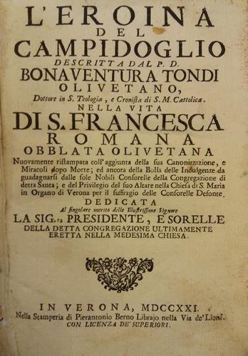 L'eroina del Campidoglio descritta dal P.D. Bonaventura Tondi olivetano. Nuovamente ristampata coll'aggiunta della sua Canonizzazione e Miracoli dopo Morte; ed ancora della Bolla delle Indulgenze. In Verona: nella Stamperia di Pierantonio Berno, 1