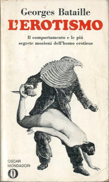 287 p. ; 19 x 11 cm. Gli Oscar. "Da lungo tempo, gli uomini parlano senza paure e apertamente di erotismo. Ciò di cui parlo è cosa ormai nota. Ho voluto semplicemente ricercare, nella diversità dei fatti descritti, una coesione. Ho tentato di fornire un quadro coerente di un insieme complesso di atteggiamenti umani. E questa ricerca di un insieme coerente che differenzia il mio tentativo da quelli della scienza. La scienza studia un problema isolato. Accumula lavori specialistici. Io ritengo che l'erotismo abbia per gli uomini un senso che la metodologia scientifica non è in grado di cogliere. L'erotismo può essere fatto oggetto di indagine solo a patto che, indagando su di esso, si indaghi sull'uomo." (G. Bataille). A cura di Paolo Caruso. Titolo originale dell'opera: "L'erotisme". Traduzione di Adriana dell'Orto. Brossura editoriale, coperta illustrata (b/n) in cartoncino flessibile plastificato opaco. Titolo impresso in rosso al piatto, in nero al dorso. Qualche segno del tempo alla coperta per il resto buon esemplare. Codice libreria 2956.