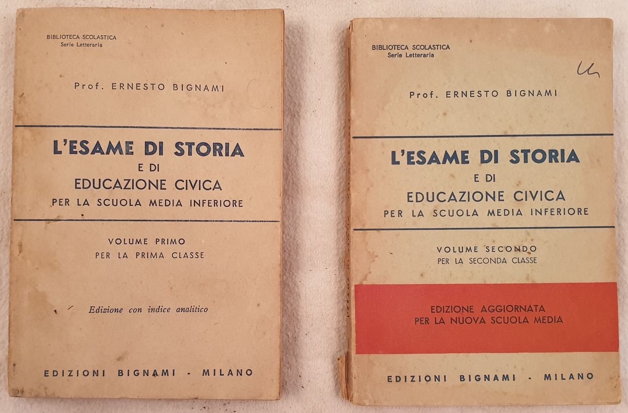 Edizione del 1967 di questo manuale di storia di Ernesto Bignami, il noto compendio. Manuale di storia per il liceo. Siamo in possesso del volume primo per la prima classe, volume secondo per la seconda classe. Il frontespizio del secondo volume è mancante. Tra gli argomenti trattati: storia orientale, storia greca, storia romana, l'Alto Medioevo, Educazione civica, Medioevo, L'eta moderna, educazione civica. In buone condizioni. Brossura editoriale in discrete condizioni generali con lievi usure e parti mancanti ai margini e dorso. Legatura in buone condizioni. Pagine in discrete condizioni con rare fioriture e bruniture. In 16. Dim. 15,5x11 cm. Pp. 291+(5), 224. Edition of 1967 of this manual of history by Ernesto Bignami, the famous compendium. Manual of history for the high school. We only have the first volume for the first class the second volume for the second class. The title page of the second volume is missing. Between the issues treated: oriental history, greek history, roman history, the Middle Age, Civic Education, Middle Age, Modern age, civic education. In good conditions. Editorial cover in fair general conditions slightly worn slighlty worn in the edges and spine. Binding in good conditions. Inside pages are in fair conditions with occasional foxings and yellowings. In 16. Dim. 15,5x11 cm. Pp. 291+(5), 224.