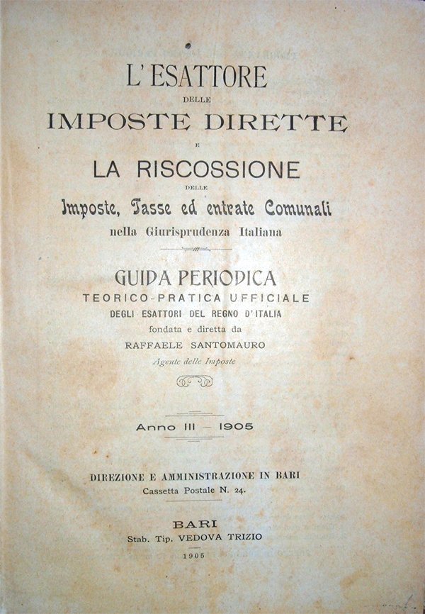 L'esattore delle imposte dirette e la riscossione delle Imposte, Tasse ed entrate Comunali nella Giurisprudenza Italiana. Guida periodica teorico-pratica ufficiale degli esattori del Regno d'Italia fondata . da Raffaele Santomauro. Anno III - 1905