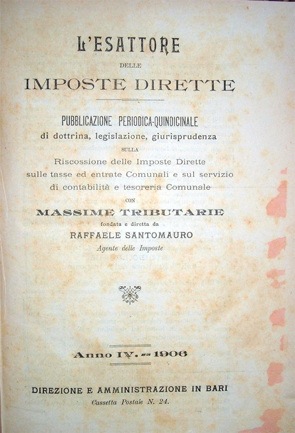 In-8°, pp. 413, (3), bella legatura coeva in mezza pelle rossa e angoli in pergamena, con titoli e fregi in oro al dorso. Tra le pagine 192 e 193 è stato inserito il fascicolo 12 bis, di 8 pagine, con numerazione propria. Normale patina del tempo alle pagine, con leggere arrossature dovute al tipo di carta. Qualche leggero segno d'umido. Alle pagine 408-409, facenti parte dell'indice analitico, all'altezza della parte centrale del margine interno dello specchio di scrittura, alcune lettere sono state reintegrate a matita in quanto cadute a seguito della rimozione di un'aderenza tra le pagine, dovuta a colla. Per il resto buon esemplare. Annata completa, che temina con il fascicolo n. 25-26 di Dicembre, di rivista quindicinale dedicata all'esazione delle imposte. Non comune. La rivista ospitava studi teorici, fungeva da guida pratica, si occupava di giurisprudenza, registrava le disposizioni ufficiali, pubblicava le risoluzioni di quesiti e casi pratici. Titolo completo: L'esattore delle imposte dirette. Pubblicazione periodica-quindicinale di dottrina, legislazione, giurisprudenza sulla riscossione delle Imposte dirette, sulle tasse ed entrate Comunali e sul servizio di contabilità e tesoreria Comunale con massime tributarie, fondata e diretta da Raffaele Santomauro, Agente delle imposte. Anno IV - 1906