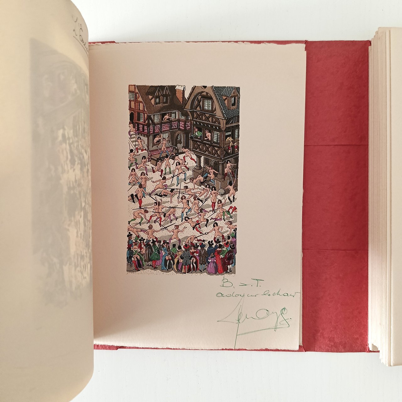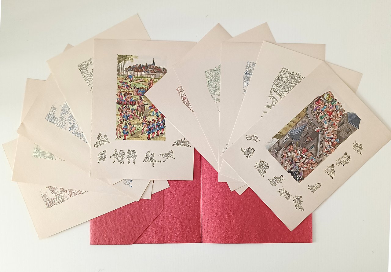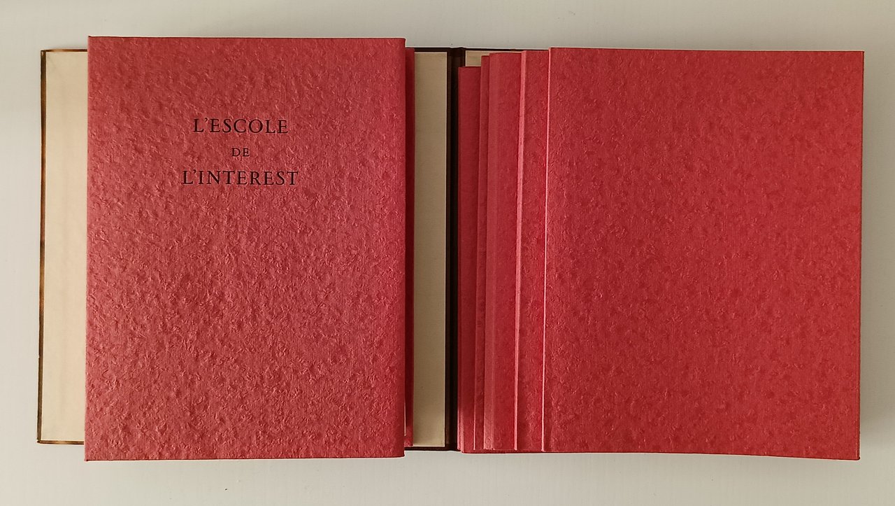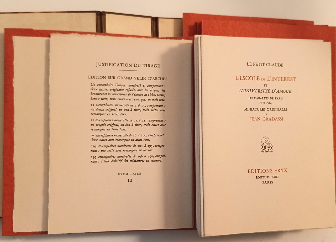 in 8° Cofanetto rigido marmorizzato, coperta sciolta con dorso in pelle, fogli e quartini sciolti in cartelline di cartoncino rosso goffrato . Con 12 miniature a colori intercalate nel testo. Tiratura di 490 copie, il nostro n. 13 è uno dei 12 esemplari che includono un disegno originale, una bozza ( bonne a tirer) quattro serie di 12 miniature in quattro diverse tonalità (invece delle tre menzionate): nero, bruno, blu e verde. In ottimo stato
