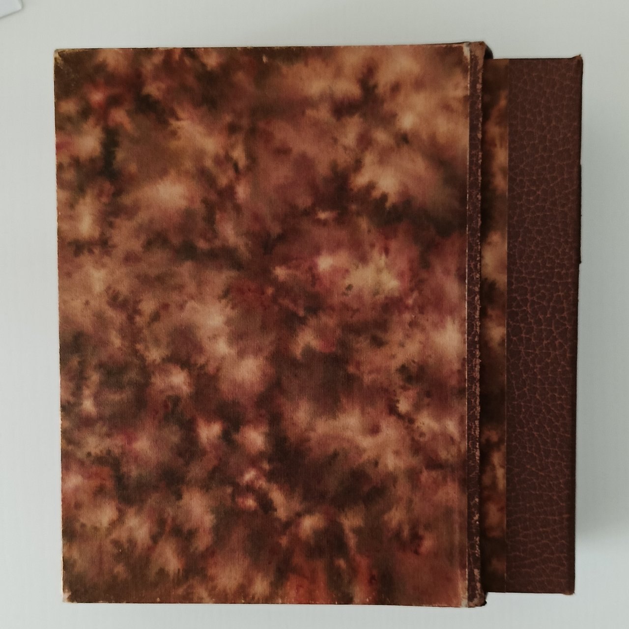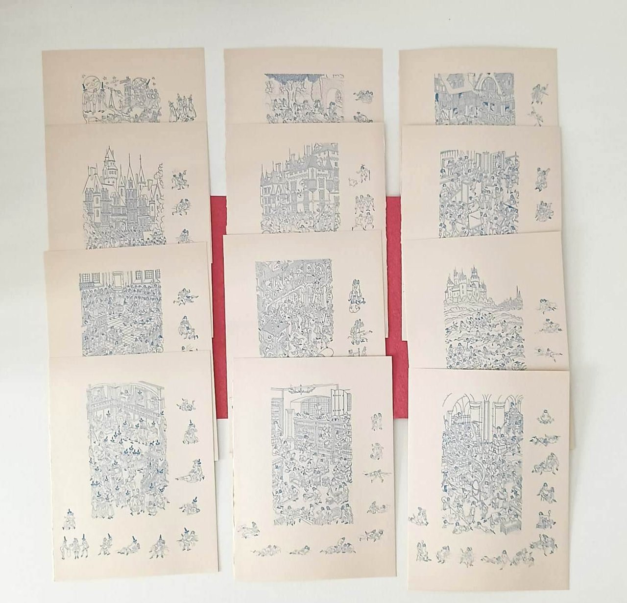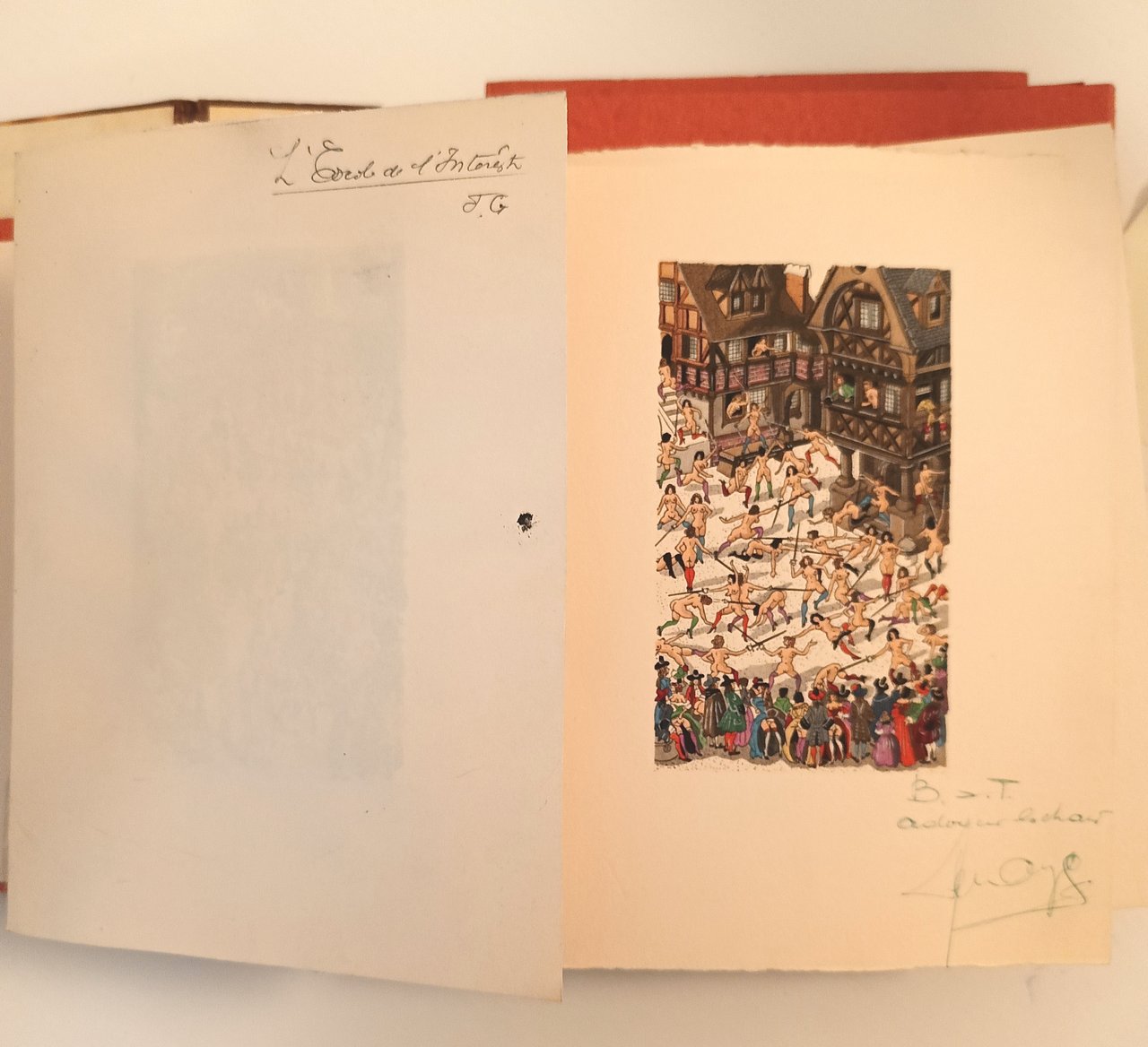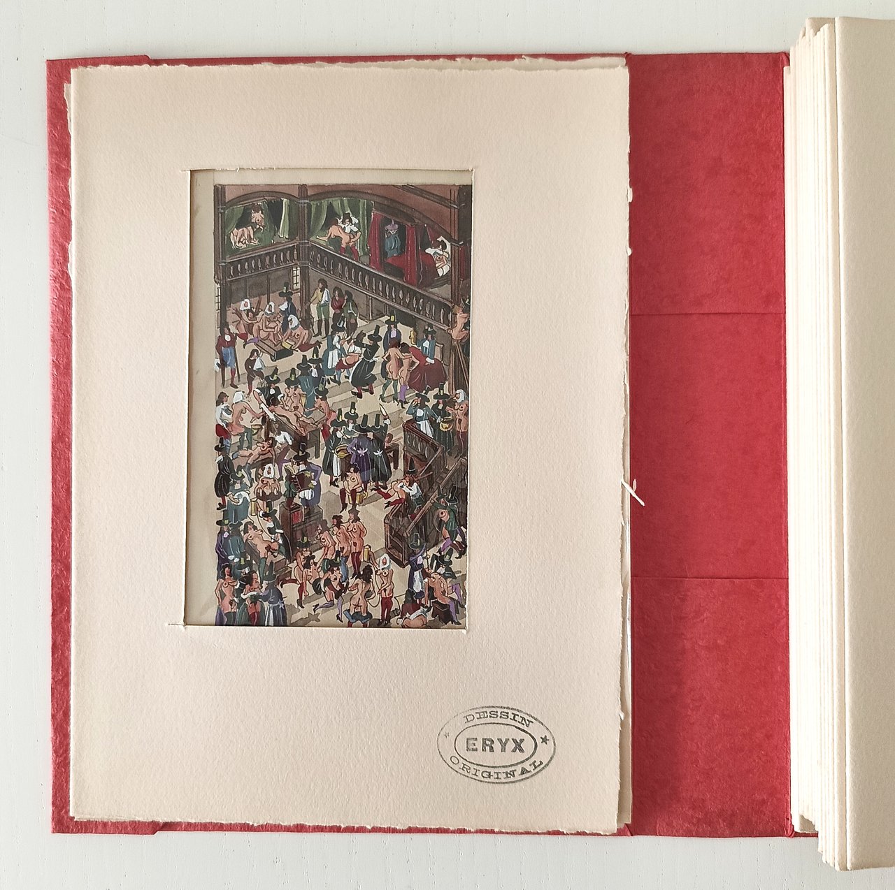 in 8° Cofanetto rigido marmorizzato, coperta sciolta con dorso in pelle, fogli e quartini sciolti in cartelline di cartoncino rosso goffrato . Con 12 miniature a colori intercalate nel testo. Tiratura di 490 copie, il nostro n. 13 è uno dei 12 esemplari che includono un disegno originale, una bozza ( bonne a tirer) quattro serie di 12 miniature in quattro diverse tonalità (invece delle tre menzionate): nero, bruno, blu e verde. In ottimo stato