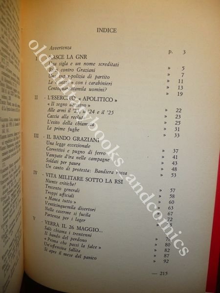 DESCRIZIONE: Isituto Nazionale per la Storia del Movimento di Liberazione Milano 1969 I^ Ed., br. ed. con risvolti pp. 216 in 8°. Il tentativo di rimettere in piedi le Forze Armate dopo il crollo dell'8 settembre significava per i fascisti dimostrare la legittimita' e la validita' della RSI. Indice completo in foto a fine inserzione. CONDIZIONI: Buone/Ottime, gore alla cop. con piccolo strappetto riparato, interni ottimi. PESO / WEIGHT: 302 gr. without package