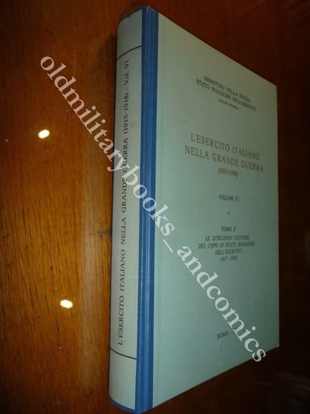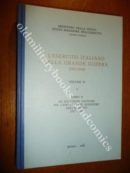 TITOLO: L'ESERCITO ITALIANO NELLA GRANDE GUERRA (1915-1918): RELAZIONE UFFICIALE - VOLUME VI : Tomo 2. LE ISTRUZIONI TATTICHE DEL CAPO DI STATO MAGGIORE DELL'ESERCITO 1917-1918 DESCRIZIONE: Ministero della Guerra- Comando del Corpo di Stato Maggiore - Ufficio Storico, Roma, 1980 br. ed. ca. pp. 528. CONDIZIONI DELL'OGGETTO: Perfette Ex-libris a timbro alla prima pagina bianca. PESO/WEIGHT: 1007 gr. without package