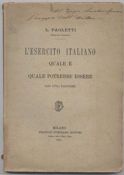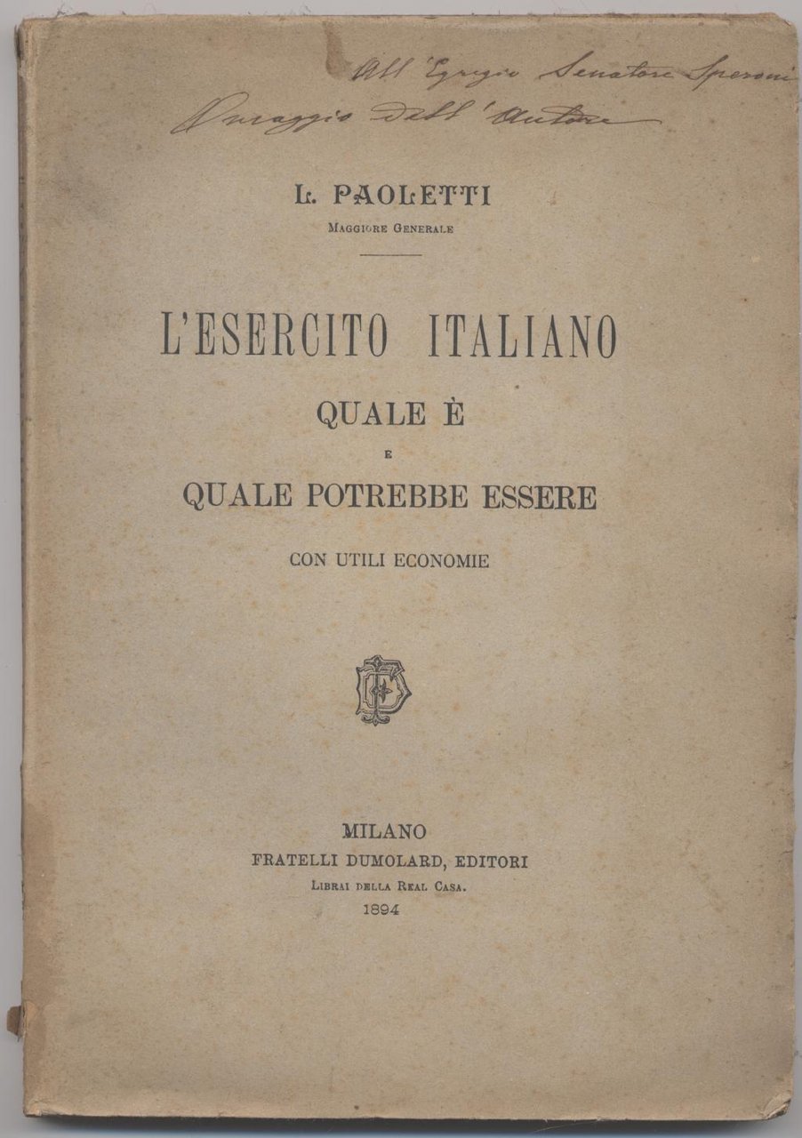 - Dedica autografa al frontespizio "All'egregio senatore Speroni omaggio dell'Autore"