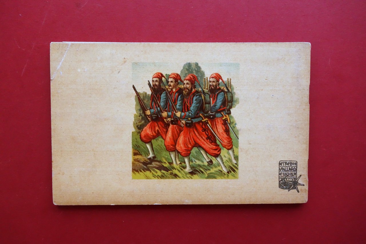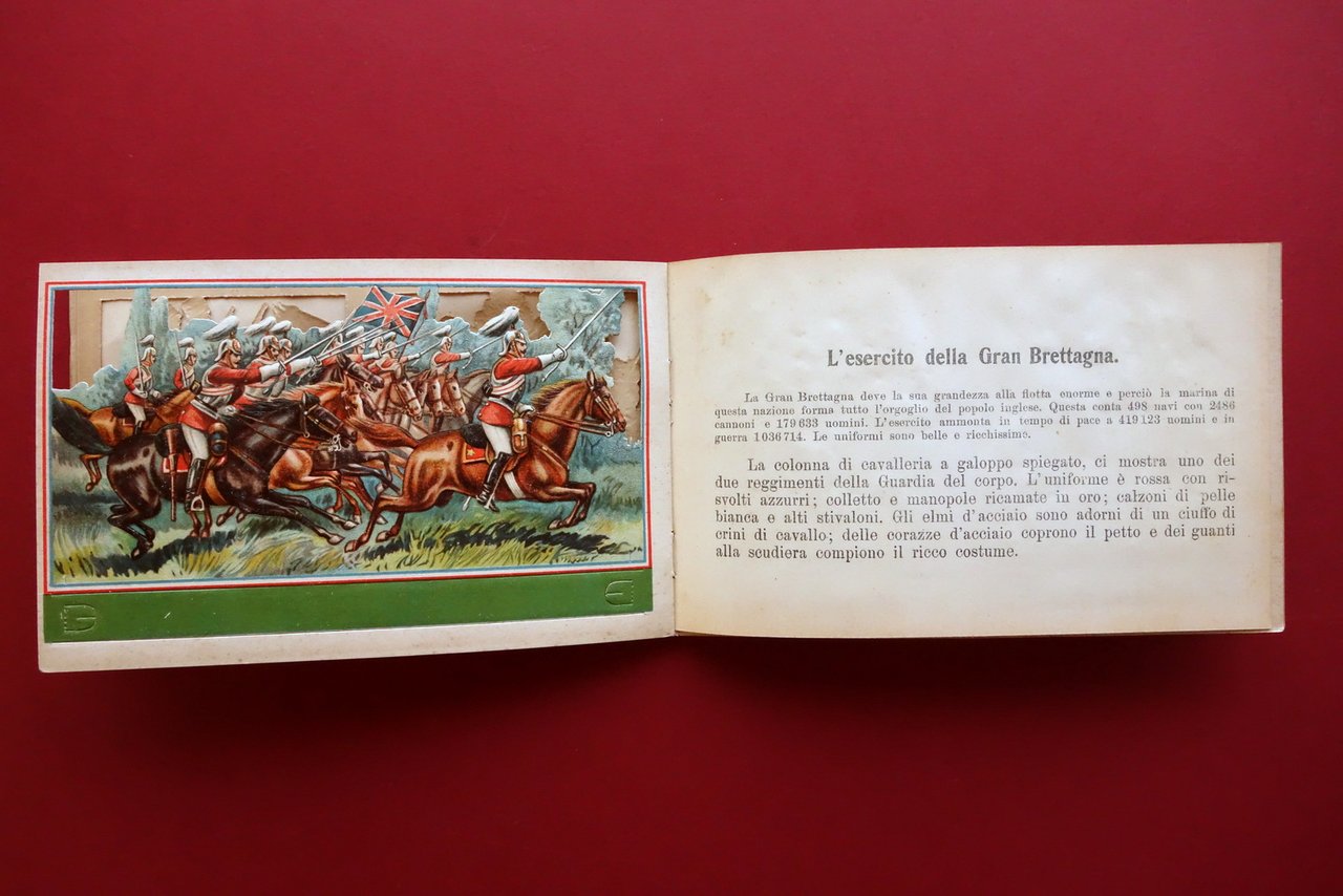 Libretto con 14 cromolitografie, L'Esercito spagnuolo, portoghese, francese, inglese, giapponese, turco, americano - 14 belle cromolitografie smontabili con basetta apribile ultimi anni dell'Ottocento - primi anni del Novecento Antonio Vallardi, Milano, s. d. ma ultimi anni dell'Ottocento - primi anni del Novecento; libretto costituito da 14 belle cromolitografie in rilievo degli eserciti sopraindicati, staccabili e con basetta apribile (vedi foto); le cromolitografie sono corredate da brevi descrizioni dei singoli eserciti. Bella copertina in cartoncino ill. a colori. Cm 13,5x21,5. Condizioni di conservazione Buone condizioni con tracce d'uso,minimi accenni di ingiallimento dovuti all'età. Interni e cromolitografie ben conservate; mancanza di una cromolitografia dell'esercito spagnolo. Gioco molto raro, anche se mancante di una cromolitografia raffigurante l'esercito spagnolo (vedi foto). Molto bello e di qualità. SETT166.L24541 N P