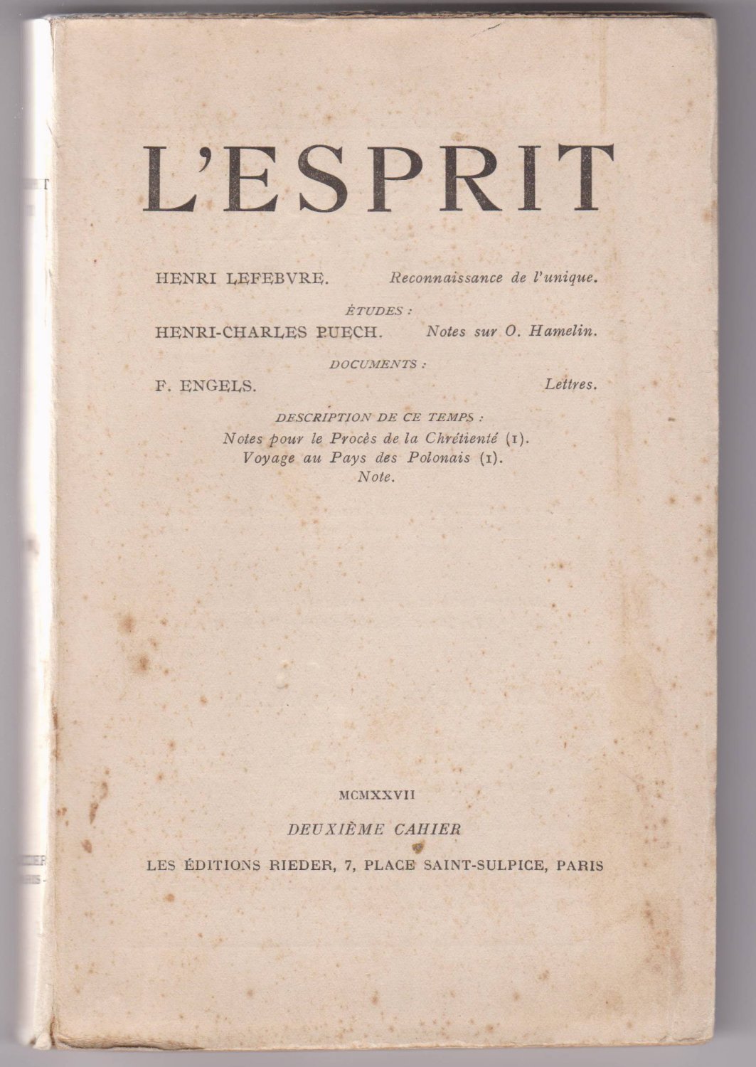 Journal "L'Esprit: Publication faite pour la Révolution" had only 2 issues: 1st issue in May 1926, 2nd issue (this) in January 1927. Includes the following contributions: Henri Lefebvre, "Reconnaissance de l'unique". Études: Henri-Charles Puech, "Notes sur O. Hamelin". Documents: F. Engels, "Lettres". Description de ce Temps: "Notes pour le Procès de la Chrétienté" (1); "Voyage au Pays de Polonais" (1); Note. All texts in French.