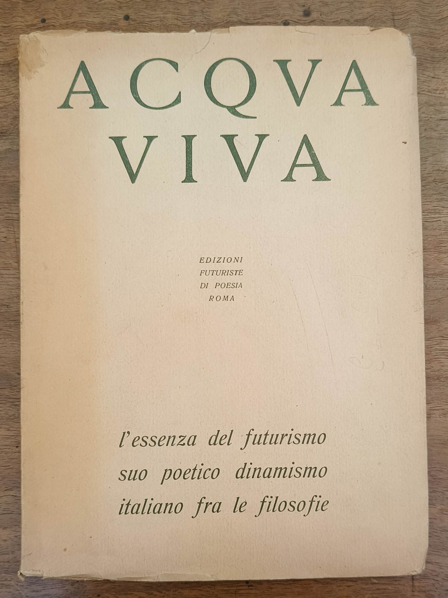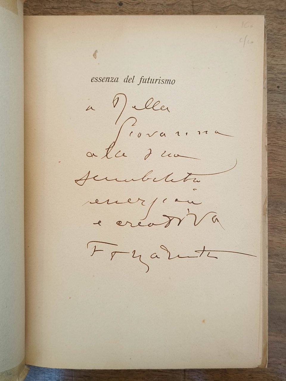 L'essenza del futurismo suo poetico dinamismo italiano fra le filosofie, Roma, Edizioni futuriste di poesia, 1941. Prima edizione. Cm 22,7. Pp. 132 (8) (pagine numerate I-XI e poi 15-131). Brossura editoriale. Pagine chiuse, leggermente brunite. L’introduzione di F.T. Marinetti è il "Manifesto d’aeropittura futurista. Maringuerra", pubblicato in volantino poco prima o contemporaneamente al volume. Dedica autografa di F.T. Marinetti a Ettore Della Giovanna (1912 - 2004, giornalista) "a la sua … energica e creativa".