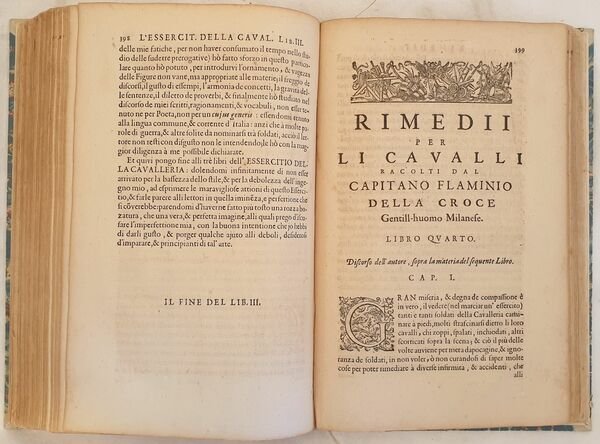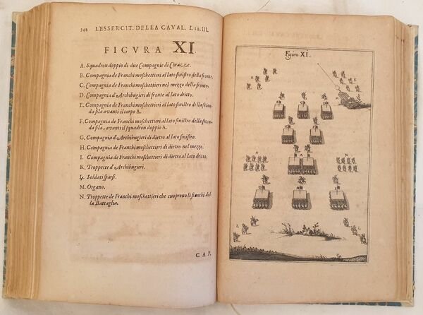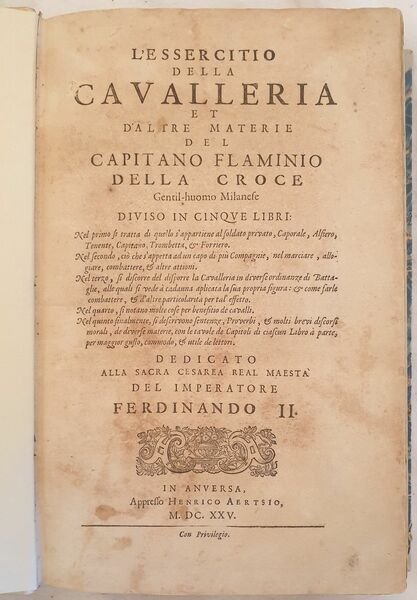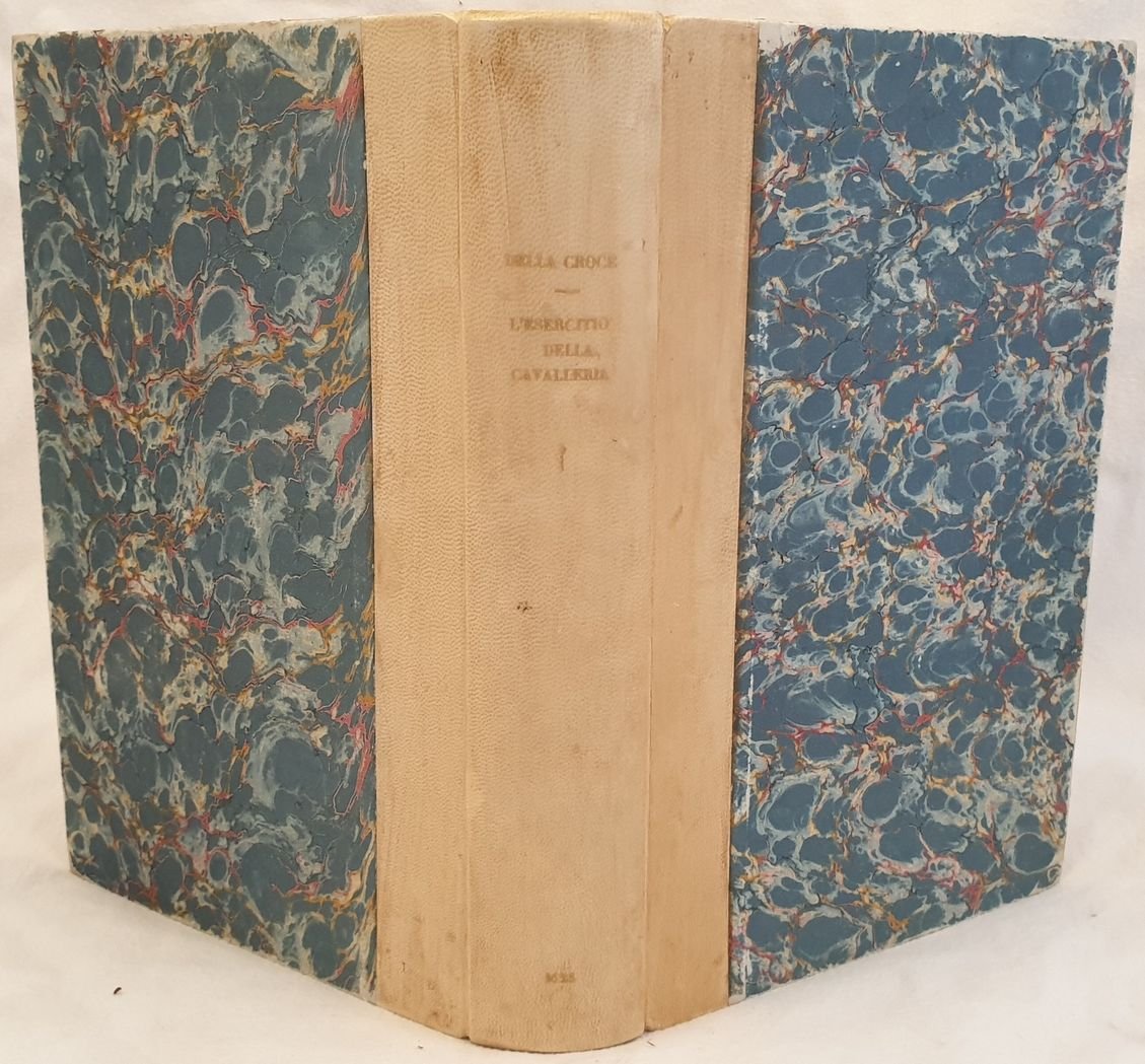 Prima edizione originale del 1625 di quest'opera sulla cavalleria composta da Della Croce, capitano di cavalleria milanese, pubblicata in italiano ma curiosamente stampata nelle Fiandre. L'esemplare contiene inoltre un bifolio segnato §, non sempre presente in tutti gli esemplari dell'edizione, contenente "Sonetti varii in lode delle opere del generoso et prudente Flaminio della Croce gentilhuomo milanese".<BR>Cockle 731 L'autore fornisce anche la descrizione delle armi e come correttamente utilizzarle. Il testo è impreziosito da 15 incisioni calcografiche che mostrano schemi di cavalleria, soldati a cavallo e diversi tipi di armi. Interessante l'ultima parte relativa ai consigli per curare i piccoli malanni dei cavalli. Un'opera importantissima per la storia della cavalleria. In ottime condizioni. Copertina in mezza pergamena moderna con titolo manoscritto al dorso in ottime condizioni con lievi usure ai margini e dorso. Legatura in buone condizioni. Pagine in buone condizioni con fioriture. Piccolo segno di tarlo al margine infriore delle pagine dalla 465 alla fine senza perdita di testo.In folio 315 x 210 mm. Pp. [(28)+566+(2)]. Peso Kg. 1,708. Contents: [(28)+566+(2)]. In folio (12.40 x 8.3 in; 315 x 210 mm) Weight Kg. 1,708. 1 vol. Little worming in the foot edge of pages from 465 to the end with no loss of text. Condition of contents: Good conditions. Foxings. 15 calcographic plates with schemes of army cavalry, soldier on their horses and different kind of weapons Condition of binding: Modern Half parchment cover in fair conditions ligtly worn in the edges. First original edition of 1625 of this work about cavalry written by Captain Flaminio della Croce from Milan. The work is written in italian language but curiously published in Flanders. This copy contains a bifolio marked §, not always included in all copies of this edition, containing Sonnets by the author "Sonetti varii in lode delle opere del generoso et prudente Flaminio della Croce gentilhuomo milanese".<BR>Cockle 731 The authors provides also description of weapons and how to use correctly them. A very important work for the history of cavalry.