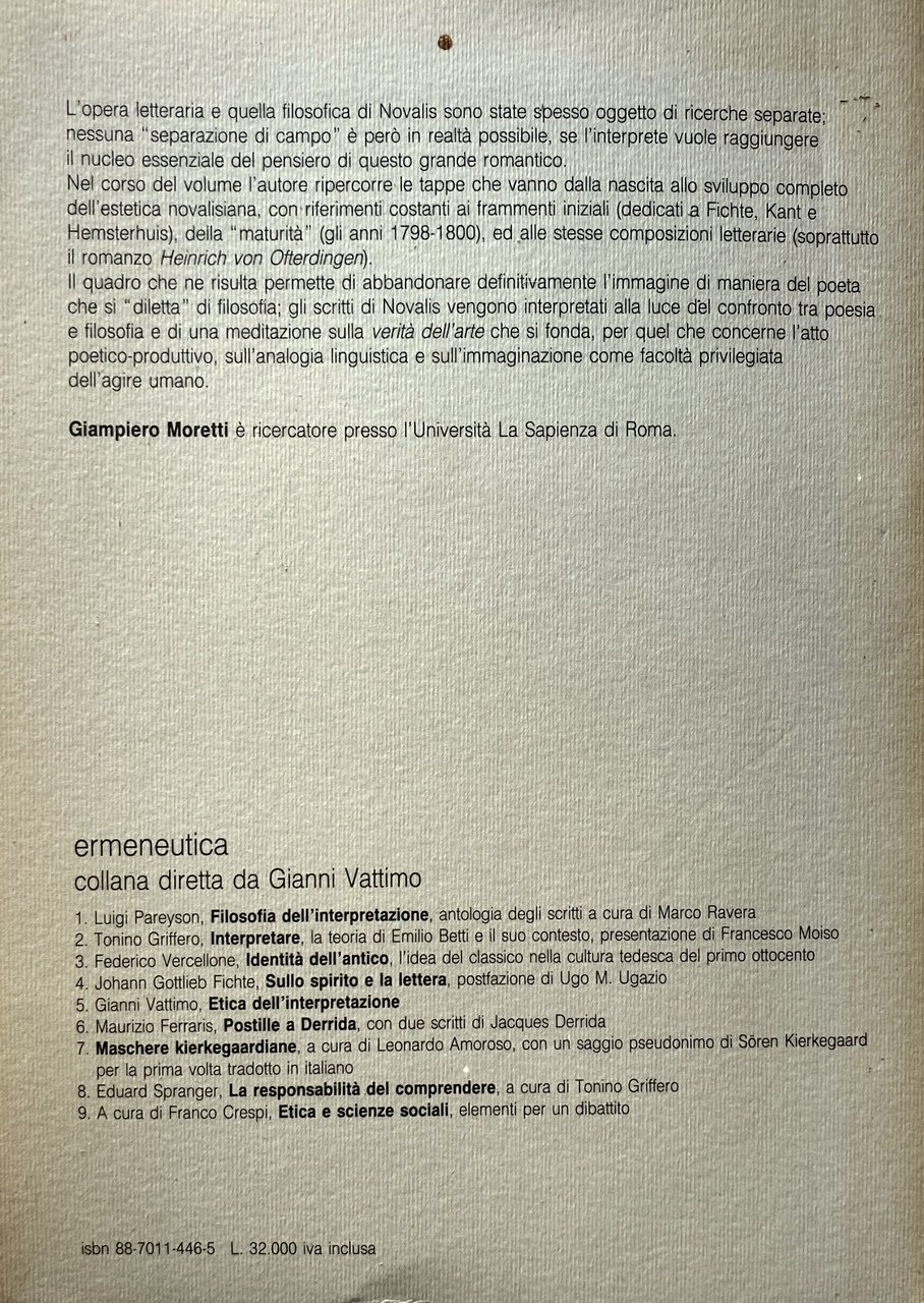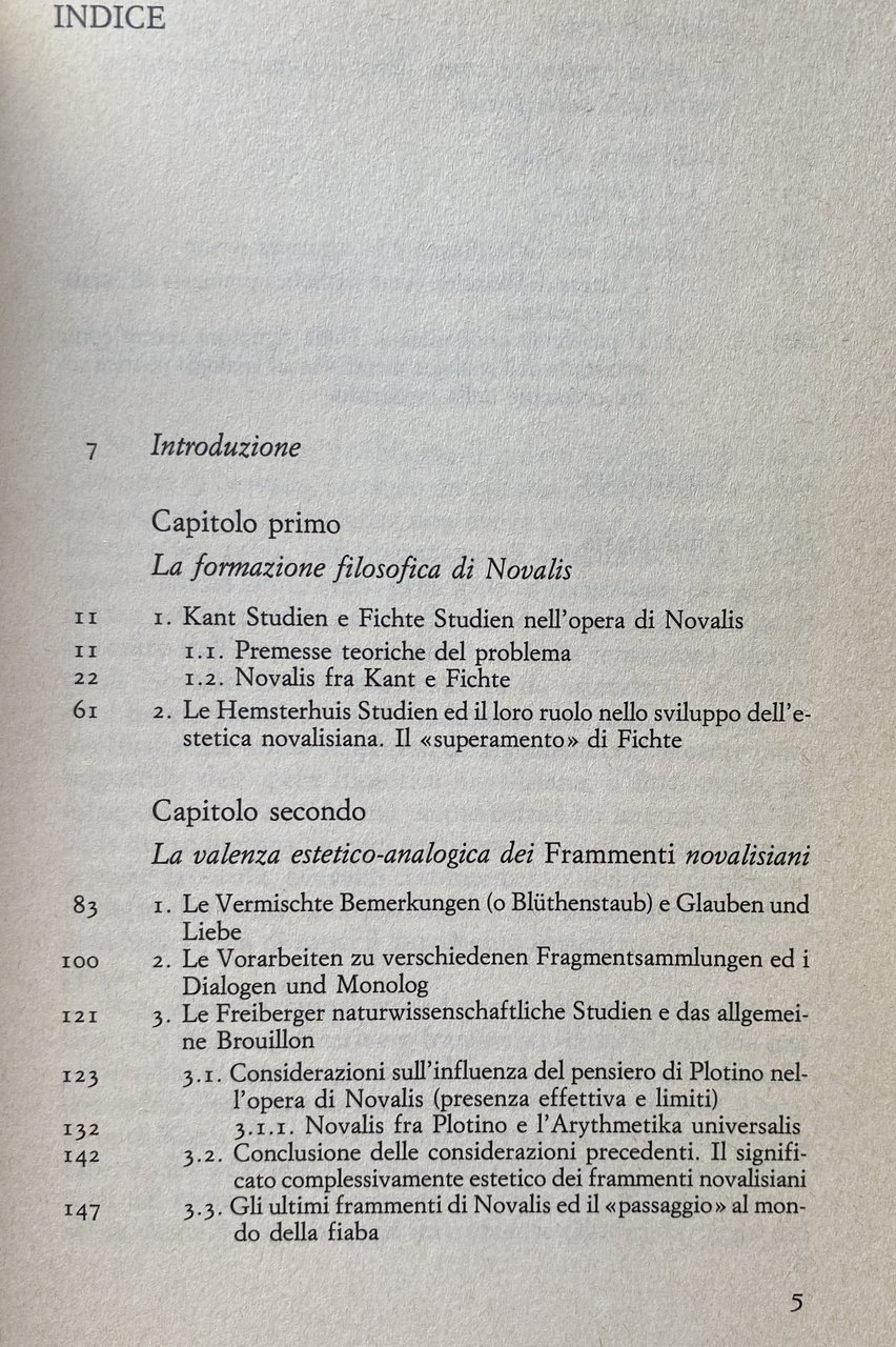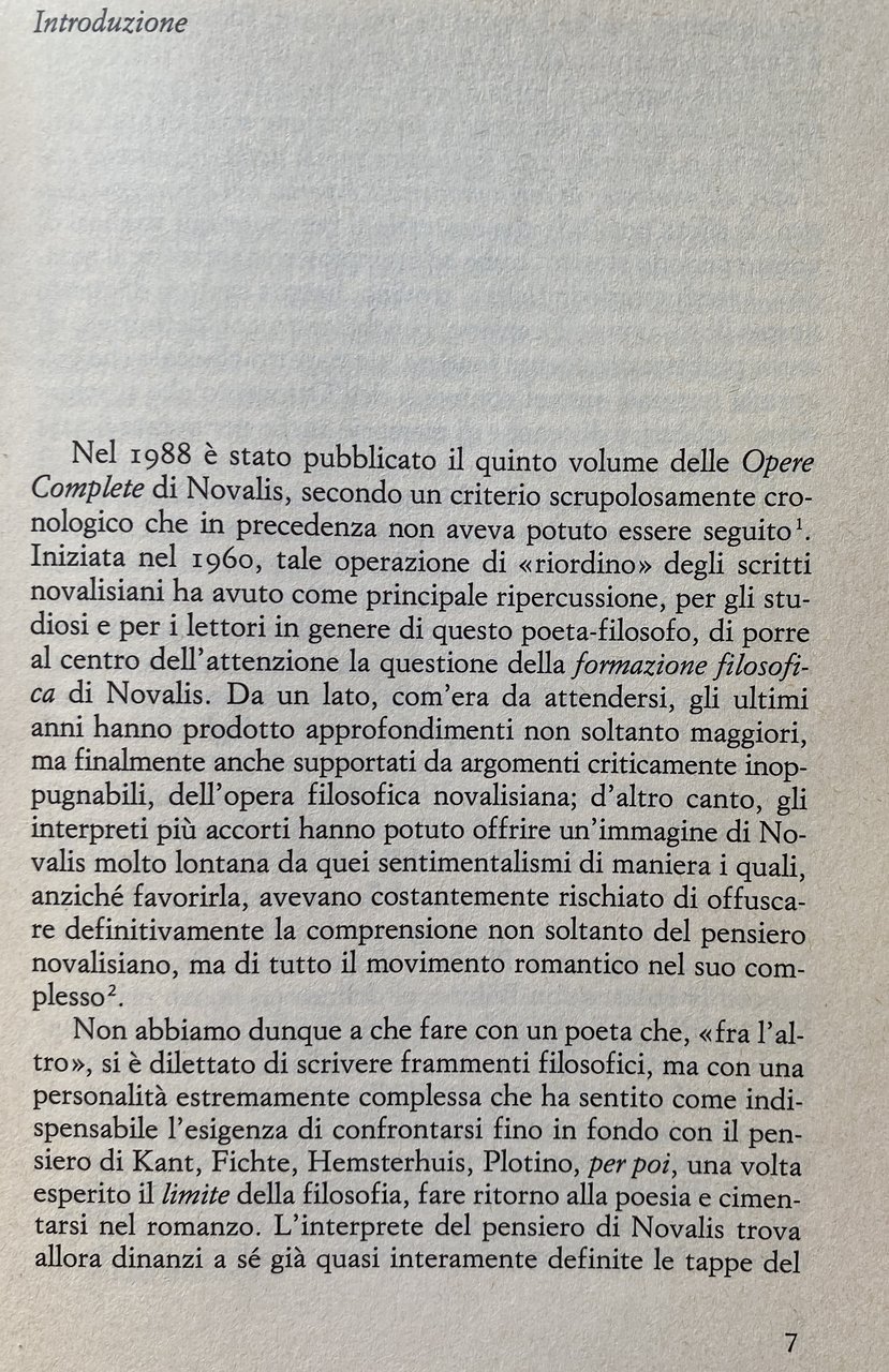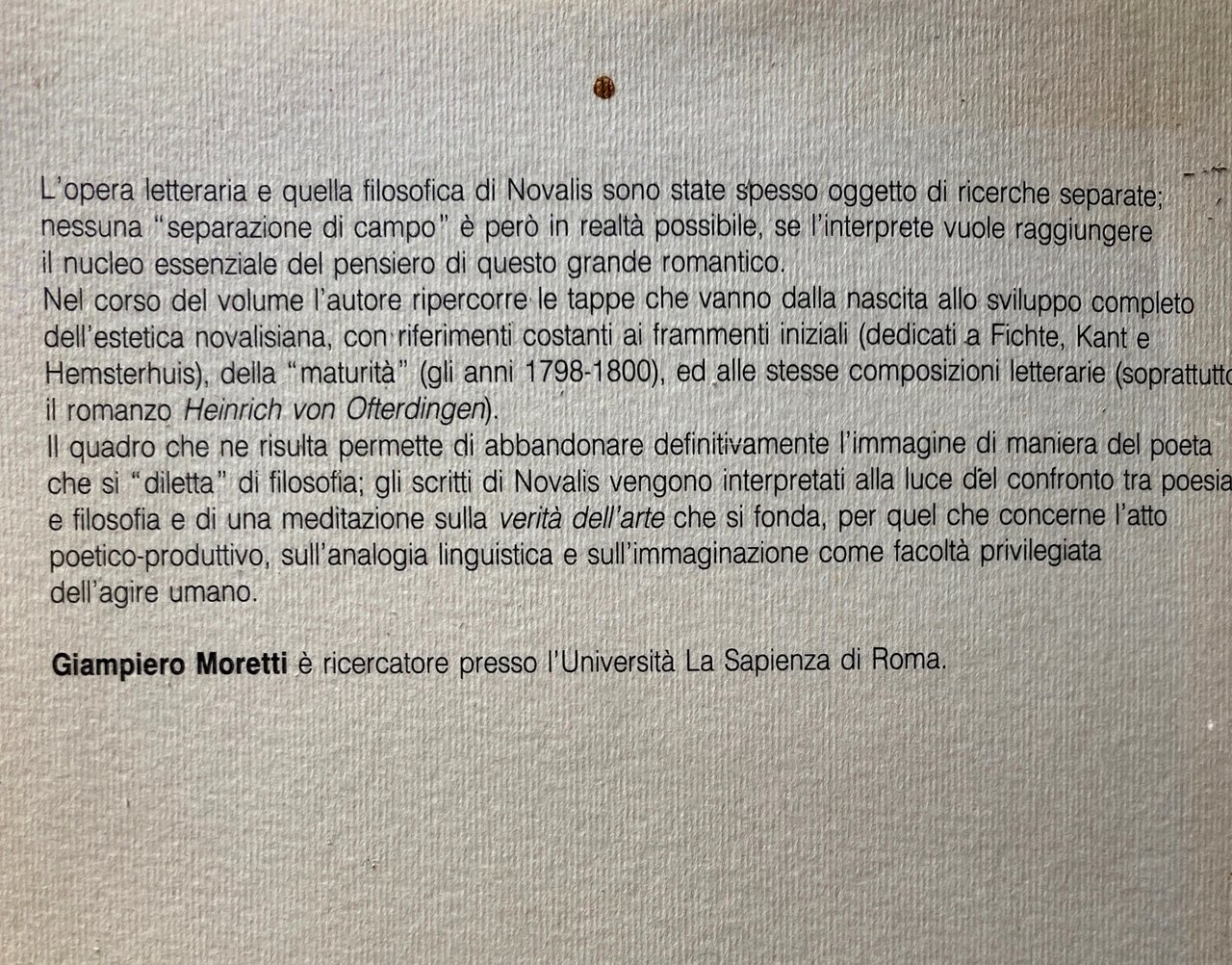 Soggetti: Critica letteraria, Psicologia, Filosofia, Estetica, Romanticismo, Poetica romantica, Letteratura tedesca, Poesia, Interpretazione, Ermeneutica, Metafisica, Profezia, Frammenti, Georg Friedrich Philipp Freiherr von Hardenberg, Scrittura novalisiana Correnti filosofiche Kant Hemsterhuis Fichte Fisica Medicina Riferimento Bibliografia Idealismo tedesco Germanistica Opere generali Europa Cultura europea Settecento Arte Libri universitari fuori catalogo Umanistica Saggi Studi Ordo inversus Heidelberg Nichilismo Bachofen Baeumler Civiltà Concetto Concezione Creuzer Analogia Dialettica Spirito Dionisiaco Dioniso Divenire Divino Femminile Filologia Natura Storia Fratelli Grimm Friedrich Schlegel Goethe Görres Greci Grecità Hamann Hegel Heidegger Herder Herderiana Hölderlin Jacob Grimm Jena Kritische Idea Linguaggio Lobeck Ludwig Klages Matriarcato Metamorfosi Mito Mitologia Mondo Mythologie Nietzsche Passato Pensiero Problema Religione Ruolo Sacralità Savigny Schelling Schiller Schlegel Scienza Senso Significato Simbolica Soggetto Spengler Spirituale Sturm und Drang Sviluppo Verità Visione I discepoli di Sais Scritti filosofici Comparatistica Paul Klee Ottocento Scienze Formazione filosofica Studien Hemsterhuis Valenza estetico-analogica Novalisiani Vermischte Bemerkungen Blüthenstaub Glauben und Liebe Vorarbeiten zu verschiedenen Fragmentsammlungen Dialogen und Monolog Freiberger naturwissenschaftliche Das allgemeine Brouillon Influenza Plotino Arythmetika universalis Fiaba Prosa Adepto Heinrich von Ofterdingen Signatura rerum Iniziazione Problema böhmiano Modernità H. Simon Romantik Deutschland Fruhromantik Utopia Kurzke Kuhn Kapitza Mahl Schanze Seidel Ritter Behler Beguin Anceschi Diltey M. Frank Givone Schriften Kritische Ausgabe Briefwechsel Werke Chimica Medicina Mineralogia Cristallologia Cristianesimo Età dell'oro Eterno Fanciulli Sublime Corporeità Mistero Immaginazione Fantasia Jurij Striedter Eros Favola Libri autografati Dedica autografa dell'autore Collezionismo Da collezione Literary criticism Psychology Philosophy Aesthetics Romanticism Romantic poetics German literature Poetry Interpretation Hermeneutics Metaphysics Prophecy Fragments writing Philosophical currents Physics Medicine Reference Bibliography German Idealism Germanistics General works Europe European culture Eighteenth century Art University books out of print Humanities Essays Studies Nihilism Civilization Concept Conception Analogy Dialectics Spirit Dionysian Dionysus Becoming Divine Feminine Philology Nature History Greekness Language Matriarchy Metamorphosis Myth Mythology Past World Thought Problem Religion Role Sacredness Science Sense Meaning Symbolic Spiritual Subject Development Truth Vision The disciples of Sais Philosophical writings Comparative studies Nineteenth century Sciences Philosophical training Aesthetic-analogical value Influence Plotinus Fairy Tale Prose Initiation Modernity Chemistry Medicine Mineralogy Crystallology Christianity Golden Age Eternal Children Sublime Corporeity Mystery Imagination Fantasy Fable Autographed books Dedication by the author Collectibles