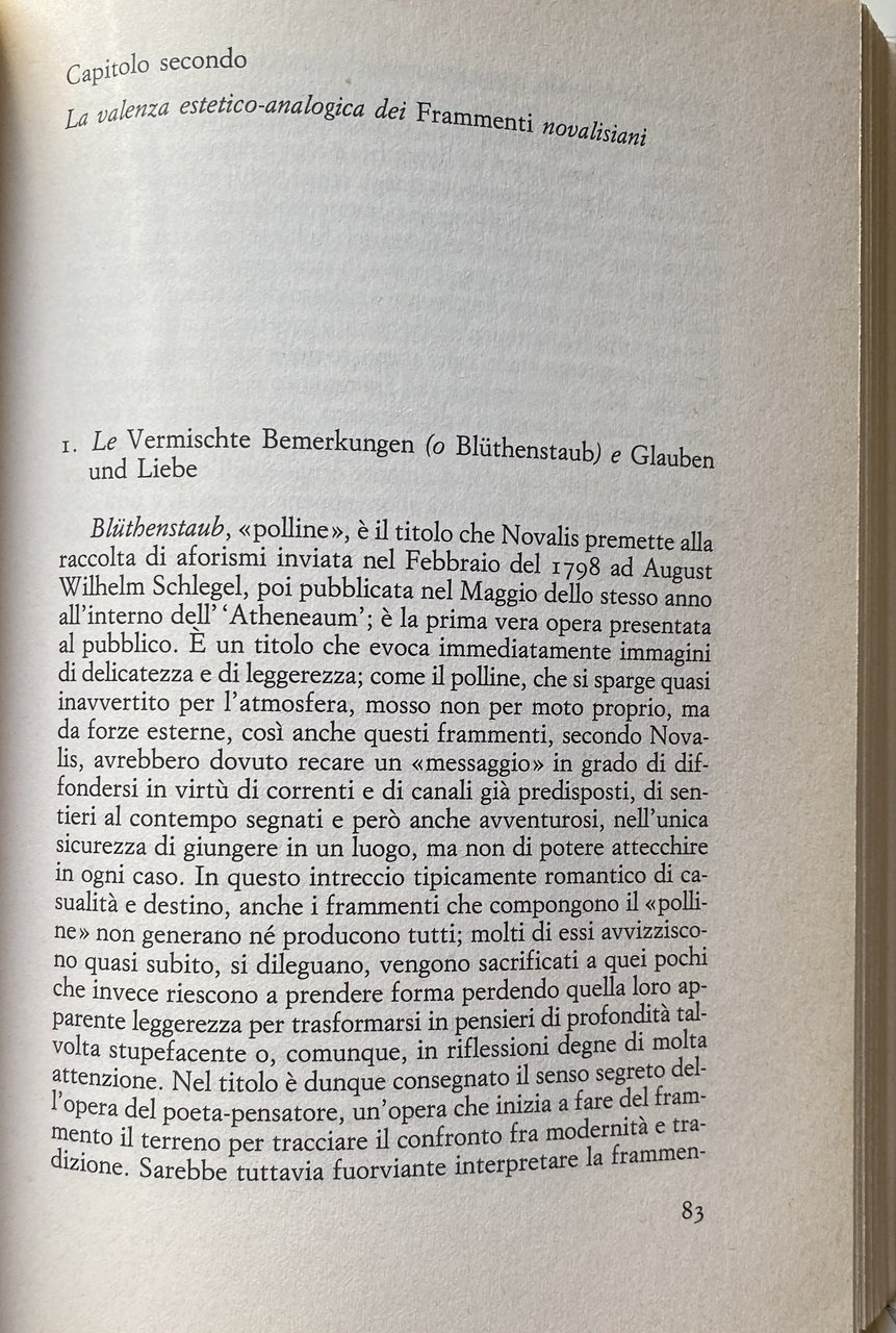 - Critica letteraria, Psicologia, Filosofia, Estetica, Romanticismo, Poetica, Poetica romantica, Letteratura tedesca, Poesia, Interpretazione, Ermeneutica, Metafisica, Frammenti, Scritti filosofici, Settecento, Ottocento, Idealismo tedesco, Sturm und Drang, Libri fuori catalogo, Saggi critici, Critica filosofica, Germanistica, Opere generali, Europa, Cultura europea, Collezionismo, Libri autografati