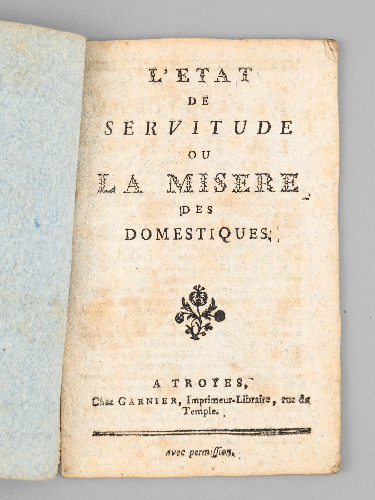 1 brochure in-12, Chez Garnier, A Troyes, s.d. [ circa 1750 ], 16 pp. Nisard consacre plusieurs pages à cette brochure de colportage, dont "la facture n'en remonte pas au delà du milieu du dix-huitième siècle, époque à laquelle on n'a jamais fait plus de vers, et où Apollon et les Muses hantaient les halles comme les boudoirs et les sacristies". Il conclut que "dans l'état actuel de nos moeurs, et eu égard à l'indiscipline et à la dépravation générale des domestiques, elle serait une lecture dangereuse. [. ] Le papier, l'impression, les fautes dont il fourmille, tout lui donne des droits à être qualifié de rossignol, et à être, comme tel, vénéré des bibliomanes". Bon état pour cette production s'intégrant à la célèbre "Bibliothèque bleue". Nisard, I, 443