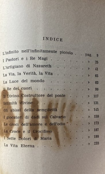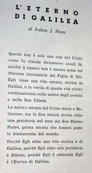 Soggetti: Gesù Cristo, Biografie, Vita, Religione, Teologia, Cristianesimo, Predicazione, San Paolo, Mistero, Incarnazione, Umiltà, Storia antica, Verbo, Carne, Miracoli, Passione, Morte, Risurrezione, Trinità, Profeta, Re, Racconti, Letteratura, Salvezza, Redenzione, Apostoli, Salvatore, Spiritualità, Poesia, Libri Vintage fuori catalogo, Collezionismo, Rarità librarie, Anni Cinquanta, Classici, Riferimento, Bibliografia, Fede, Eternità, Sacrificio, Fanciullezza, Croce, Calvario, Esistenza, Biografia intima, Giudizio, Dio, Grazia, Volontà, Libertà, Sacramenti, Dolore, Sofferenza, Amore, Peccato, Sacerdote, Intermediario, Vita Divina, Maria, Preghiera, Infanzia, Infinito, Bambini, Regno dei cieli, Erode, Sapienza, Divinità, Eternità, Redenzione, Perdono, Gioia, Pastori, Magi, Adorazione, Avvento, Betlemme, Galilea, Nazareth, Palestina, Terra Santa, Ebrei, Giudei, Tradimento, Farisei, Chiesa, Paradiso, Madre, Padre, Figlio, Senso, Significato, Anima, Impero romano, Felicità, Ponzio Pilato, Satana, Luce, Saggezza, Ricchezza interiore, Povertà, Tempio, Gerusalemme, Seguaci, Montagna, Discorsi, Parola, Verbo, Verità, Umanità, Mosè, Messia, Insegnamenti, Bibbia, Antico Testamento, Testimonianze, Vangeli, Esegesi biblica, Cattolicesimo, Da collezione, Vergine, Odio, Sette dolori, Via Crucis, Misericordia, Perdono, Giocatori di dadi, Scommesse, Personaggi evangelici, Benedizione, Bellezza, Menzogne, Messaggio, Ultima Cena, Vino, Pane, Gerico, Terra Promessa, Israele, Giovanni, Deserto, Mar Morto, Tabernacolo, Maritain, Lunn, Belloc, Chesterton, Crucifige, Pasqua, Domenica delle Palme, Venerdì santo, Davide, Orgoglio, Pagani, Agnello, Geova, Virtù, Vizio, Rabbini, Deicidio, Antiquariato, Jesus Christ, Biographies, Life, Religion, Theology, Christianity, Preaching, Saint Paul, Mystery, Incarnation, Humility, Ancient history, Word, Flesh, Miracles, Passion, Death, Resurrection, Trinity, Prophet, King, Tales, Literature, Salvation, Redemption, Apostles, Savior, Spirituality, Poetry, Books out of print, Collecting, Rarities, Fifties, Classics, Reference, Bibliography, Faith, Eternity, Sacrifice, Childhood, Cross, Calvary, Existence, Intimate biography, Judgement, God, Grace, Will, Freedom, Sacraments, Pain, Suffering, Love, Sin, Priest, Mediator, Divine Life, Mary, Prayer, Childhood, Infinity, Children, Kingdom of Heaven, Herod, Wisdom, Divinity, Eternity, Redemption, Forgiveness, Joy, Shepherds, Adoration, Advent, Bethlehem, Galilee, Nazareth, Palestine, Holy Land, Jews, Betrayal, Pharisees, Church, Paradise, Mother, Father, Son, Sense, Meaning, Soul, Roman Empire, Happiness, Pontius Pilate, Satan, Light, Wisdom, Inner Wealth, Poverty, Temple, Jerusalem, Followers, Mountain, Speeches, Word, Verb, Truth, Humanity, Moses, Messiah, Teachings, Bible, Old Testament, Testimonies, Gospels, Biblical Exegesis, Catholicism, Collectables, Virgin, Hatred, Seven Sorrows, Via Crucis, Mercy, Forgiveness, Dice Players, Betting, Gospel Characters, Blessing, Beauty, Lies, Message, Last Supper, Wine, Bread, Jericho, Promised Land, Israel, John, Desert, Dead Sea, Tabernacle, Passover, Palm Sunday, Good Friday, David, Pride, Pagan, Lamb, Jehovah, Virtue, Vice, Rabbis, Deicide, Antiques