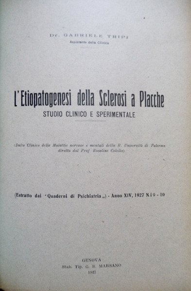 Genova, Stab. Tip. G. B. Marsano, 1927 (Estratto dai "Quaderni di Psichiatria"). Folio; 11 pp. Cubiertas originales.