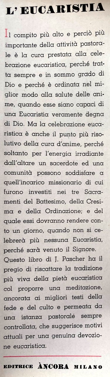 Il compito più alto e perciò più importante della attività pastorale è la cura prestata alla celebrazione eucaristica, perché tratta sempre e in sommo grado di Dio e perché è ordinata nel miglior modo alla salute delle anime, quando esse siano capaci di una Eucaristia veramente degna di Dio. Ma la celebrazione eucaristica è anche il punto più risolutivo della cura d'anime, perché soltanto per l'energia irradiante dall'altare un sacerdote ed una comunità possono soddisfare a quell'incarico missionario di cui furono investiti nei tre Sacramenti del Battesimo, della Cresima e della Ordinazione; e del quale essi dovranno rendere conto un giorno, quando non si celebrerà più nessuna Eucaristia, perché sarà venuto il Signore, Questo libro di J. Pascher ha il pregio di riscattare la tradizione più viva della pietà eucaristica col proporre una meditazione, ancorata ai migliori testi della fede e del culto e permeata da una istanza pastorale sempre controllata, che suggerisce motivi attuali per una genuina devozione eucaristica.