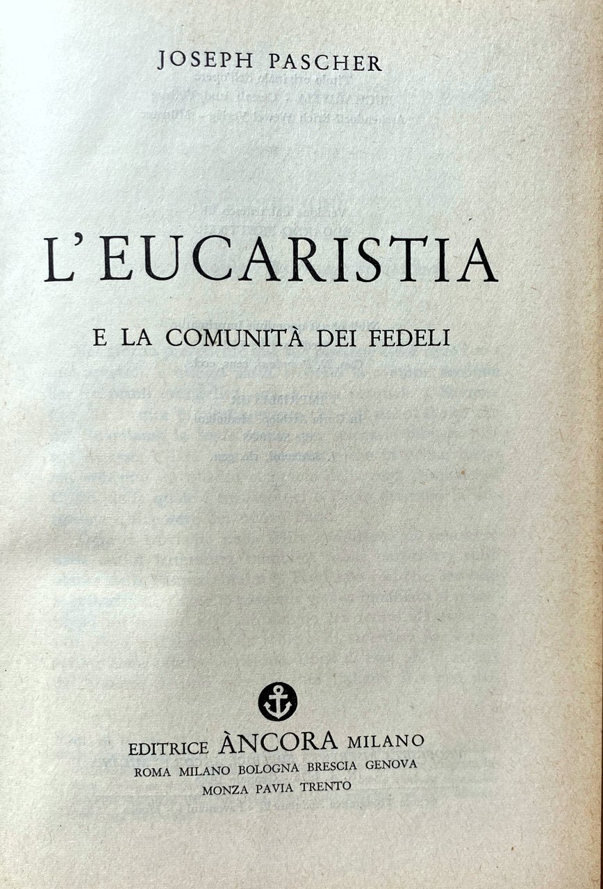 Soggetti: Teologia, religione, Cristianesimo, Esegesi biblica, Bibbia, Critica, Sacramenti, Pasqua ebraica, Ebraismo, Cattolicesimo, Chiesa, Tradizione, Celebrazioni, Vangeli, san Paolo, Eucaristia, Giovanni, Gesù Cristo Sinagoga Cafarnao, Transustanziazione Discepoli Pane, Ultima Cena Agnello Sacrificio Agnus Dei Alleluia Altare Apostoli Resurrezione Preghiera Liturgia Coscienza Vino Ringraziamento Dossologia Istituzioni Epiclesi Doni Comunità Canto Credenti Dio Spirito Santo santo Pasto Messa Signore Gloria Giustino Calice Comunione Consacrazione Culto Vita Corpo Sangue Amore Mediatore Popolo Mistero Mistico Orazione Pasquale Sacerdozio Salmi Rito Canone romano Rituali Culti sacramentali Significato Figlio Simbolismo Battesimo Esecuzione Salmo Judica Peccato Colpa Miracoli Redenzione Remissione Collezionismo Catechesi Catechismo Libri rari Vintage fuori catalogo Saggi critici Studi teologici Kyrie Litanie Confessione Vangelo Parola Catecumeni Mensa Presenza eucaristica Ostia Iconostasi Verbo Padre Nostro Consumazione Fedeli Partecipazione Festa Lingua Missione Conviviale Altare Domine Sancte Inni Lode Santi Glorificazione Grazia Offerta Antico Testamento Israeliti Mosè Esodo Alleanza Ebrei Farisei Tempio Testi rabbinici Matteo Marco Gerusalemme Tommaso d'Aquino Patto Trento Concilio Vaticano Papa Lettere Romani Regno Benedizione Calice Lezioni Confiteor Magistero Pio XII Costituzioni Pietro Ambrogio Clemente Patristica Patrologia Migne Rahner Ore Messale Das Stundengebet Römischen Kirche Antifona Antifonario Sant'Agostino Benedetto da Norcia Vescovo Breviario Libro Caesarius Domine Dominus Notturno Epifania Quaresima Feste Gallo Hanssen Settimana Santa Horen Lettura Ultimi Linderbauer Litania Magnificat Maria Martiri Monaci Monastici Ufficio Prudenzio Salmodia Salterio Regola Responsorio Chiusura Scrittura Domenica Te Deum Versetto Vespri Veglia Natale Luca Prima lettera Corinzi Azzimo Musica Didaché Apologia Ignazio di Antiochia Gelasiano Omelia Ecumenismo Monte Sinai Memoriale Anamnesi Sacerdote Ave Adorazione Pentecoste Rito romano Venerdì Sabato De venerabili Sacramento Altaris Alfonso Maria de' Liguori Caterina da Siena Margherita Maria Alacoque Francesco di Sales Josemaría Escrivá de Balaguer Riforma liturgica Protestantesimo Ortodossa Germania Belgio Paolo VI Devozione Benno Gut Annibale Bugnini Anatema Sancta sanctis Diritto canonico Dominik Duka Faverney Torino Lourdes Beati Gesuiti Ignazio di Loyola Teresa d'Avila, Bernardo di Chiaravalle Giovanni Bosco Anna Katharina Emmerick Angela da Foligno Sacra Sindone Sudario Oviedo Ave verum corpus Pange lingua Hostia Robert Sarah Mottetti Panis Angelicus Lauda Sion Salvatorem Lutero Calvino Colloqui Marburgo Consustanziazione Koinonia Cristologia Salvezza Apocalisse Commistione Consacrazione Rendiamo grazie Mani A. Naegele Crisostomo Worterbuch Sacerdozio De Trinitate J. Braun Michl Duchesne Jungmann Eleison K.H. Connolly J.W. Tyrer Pontificale Theology Religion Christianity Biblical exegesis Bible Criticism Sacraments Passover Judaism Catholicism Church Tradition Celebrations Gospels Saint Paul Eucharist John Jesus Christ Synagogue Capernaum Transubstantiation Disciples Bread Last Supper Lamb Sacrifice Hallelujah Altar Apostles Resurrection Prayer Liturgy Conscience Wine Thanksgiving Doxology Institutions Epiclesis Gifts Community Singing Believers God Holy Spirit Meal Mass Lord Glory Justin Chalice Communion Consecration Worship Life Body Blood Love Mediator People Mystery Mystical Easter Prayer Priesthood Psalms Rite Roman Canon Rituals Sacramental Cults Meaning Son Symbolism Baptism Execution Psalm Sin Guilt Miracles Redemption Remission Collecting Catechesis Catechism Rare books out of print Critical essays Studies theological Litanies Confession Gospel Word Catechumens Table Eucharistic Presence Host Iconostasis Word Our Father Consumption Faithful Participation Feast Language Convivial Mission Domine Sancte Hymns Praise Saints Glorification Grace Offering Old Testament Israelites Moses Exodus Alliance Jews Pharisees Temple Rabbinical texts Matthew Mark Jerusalem Thomas Aquinas Covenant Vatican Council Pope Letters Romans Kingdom Blessing Chalice Lessons Confiteor Magisterium Pius XII Constitutions Peter Ambrose Clement Patristics Patrology Hours Missal Antiphon Antiphonary Saint Augustine Benedict Nursia Bishop Breviary Nocturnal Book Epiphany Lent Feasts Gallus Holy Week Reading Last Litany Magnificat Mary Martyrs Monks Monastics Office Prudentius Salmody Psalter Rule Responsory Closing Scripture Sunday Verse Vespers Christmas Vigil Luke First Letter Corinthians Unleavened Music Apology Ignatius Antioch Gelasian Homily Ecumenism Mount Sinai Memorial Anamnesis Priest Adoration Pentecost Roman Rite Friday Saturday Sacrament Catherine Liturgical Reform Protestantism Orthodox Germany Belgium Paul VI Devotion Anathema Canon Law Blesseds Jesuits Ignatius Bernard of Clairvaux Holy Shroud Language Luther Calvin Conversations Marburg Consubstantiation Christology Salvation Apocalypse Communion Consecration We give thanks Hands Pontifical Priesthood