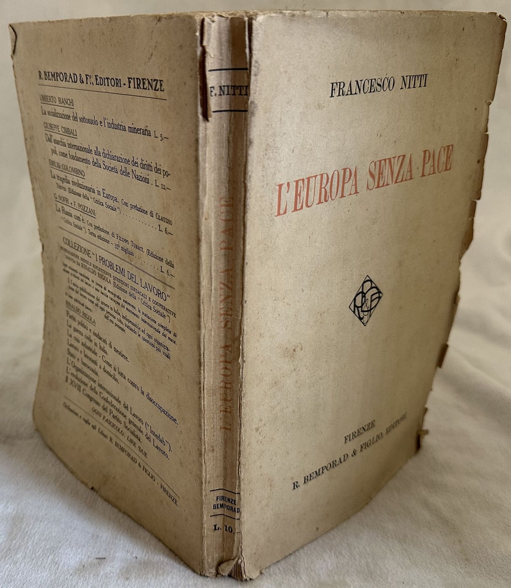 Prima edizione, dal 1° al 10° migliaio, di questo studio dell'economista e politico Francesco Saverio Nitti (1868-1953) ex Presidente del Consiglio dei Ministri del Regno d'Italia e più volte Ministro. Fu tra i massimi esponenti del meridionalismo e tra gli studiosi delle cause del brigantaggio. Questo volume, in sè completo, era parte di una trilogia sulla politica in Europa. All'interno: L'Europa senza pace; I trattati di pace la loro origine e i loro scopi, I vicnitori e i vinti; La indennità del nemico vinto e le preoccupazioni dei vincitori, la ricostruzione dell'Europa dopo la guerra e la politica della pace. Ritratto di Nitti in antiporta. In buone condizioni. Copertina editoriale in buone condizioni generali con lievi usure ai margini e dorso. Legatura in buone condizioni. Pagine in buone condizioni con rare fioriture. In 8. cm 24,5x17. Pp. 252+(1)