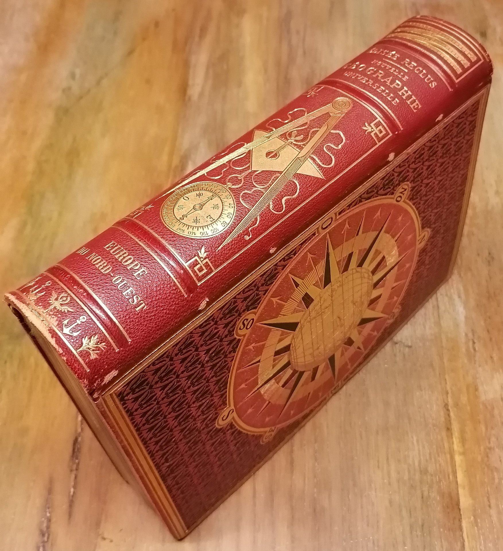 (Opere geografiche di Reclus - Europa) In 4°, legatura editoriale (firmata Magnier) con dorso in marocchino rosso, piatti in tela, tagli dorati. Ai piatti emisferi e rosa dei venti impressi in nero ed oro, al dorso strumenti scientifici, titolo e fregi dorati, pp. (4),970,(2), con 6 carte geografiche a colori fuori testo, 205 carte nel testo e 81 vedute (molte a piena pagina) nel testo. Collana "Nouvelle Gèographie Universelle". Volume ben conservato.