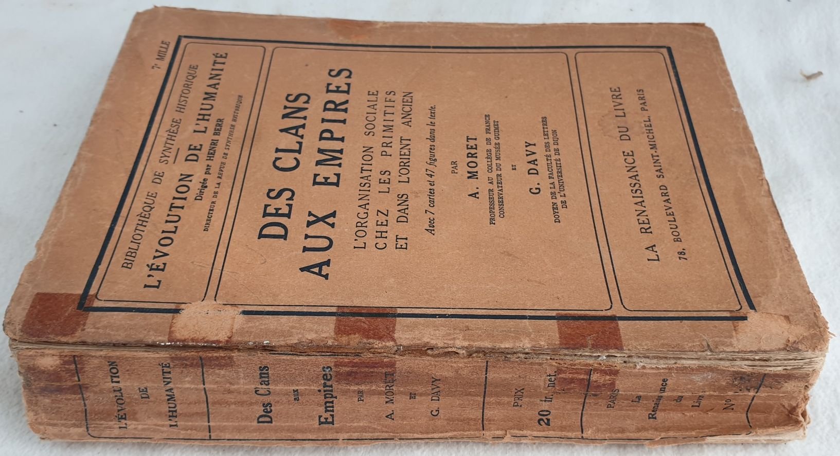 Edizione del 1923 di questa monografia dell'organizzazione sociale nei popoli primitivi e nell'Antico Oriente scritto da Moret e Davy della collana "L'evolution de l'humanite". All'interno: Organizzazione totemica, Origine della vita sociale e istituzioni politiche in Egitto, Regime egiziano e suoi vicini sotto l'Antico Impero, Mondo semitico fino all'anno 2000, invasioni iraniani e asiatiche e l'Impero Barbaro degli Hyksos, Impero egiziano, Egiziano ittita e popoli del Nord ecc. Note manoscritte a matita. In discrete condizioni. Copertina editoriale in discrete condizioni generali con usure ai margini e dorso. Segni di nastro adesivo al piatto anteriore e piatto posteriore mancante. Legatura in discrete condizioni con rotture. Pagine in ottime condizioni con rare fioriture. In 8. Dim. 20,5x14,5 cm. Pp. XXVIII+430+(2)Edition of 1923 of this monography about the social organisation in pre-historian people and Antique Middle East written by Moret and Davy of the serries "L'evolution de l'humanite". In fair conditions. Editorial cover in fair general conditions lightly worn in the extremities. Signs of adhesive tape in the front plate and back plate lacking. Binding in fair conditions. Inside pages are in very good conditions with occasional foxing. In 8. Dim. 20,5x14,5 cm. Pp. XXVIII+430+(2)