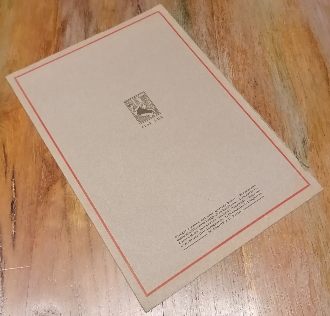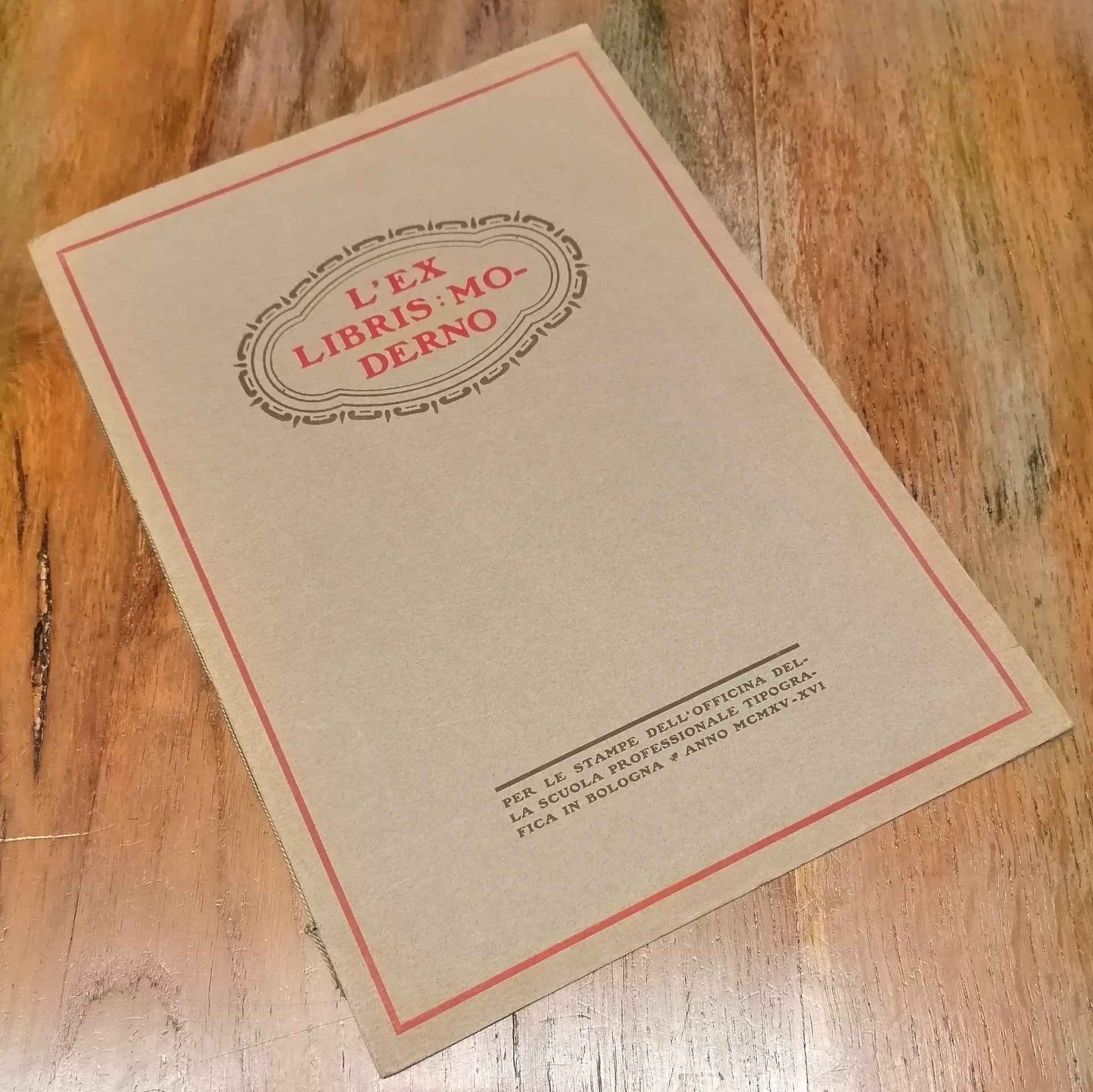 (Ex libris - Arte grafica) In 4° (cm 34 x 24,5), cartoncino editoriale grigio , titolo in rosso entro fregio e cornice al piatto anteriore, pp. 8 (frontespizio con titoli e marca tipografica entro doppia cornice, 4 ex libris in sanguigna nel testo al centro della pagina, 3 piccoli ex libris intercalati nel testo). Disegni a penna del prof. Quirino Pileri. Zincografie dello Stabilimento Poligrafico Emiliano. Compositori : Cesare Ratta, Umberto Bacchelli. Impressori : Primo Sisti, A. Contavalli, F. Tangerini, M. Febrilli e O. Parisi. Pubblicazione per l'anno MCMXV - XVI della Scuola Professionale Tipografica di Bologna fondata dal tipografo Cesare Ratta nel 1913. Ben conservato.