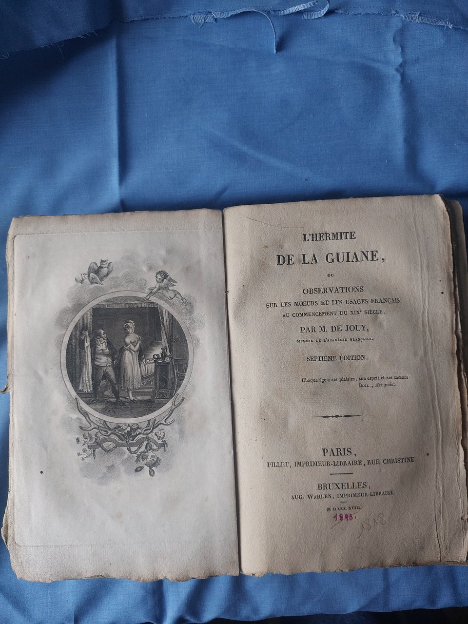 430 pp., broché, dos cassé, 1 frontispice, septième édition, édition "pirate", Débute: "N° Ier - 16 juillet 1815 arrivée de l'hermite de la Guiane.". Tome dixième des "prosateurs français"