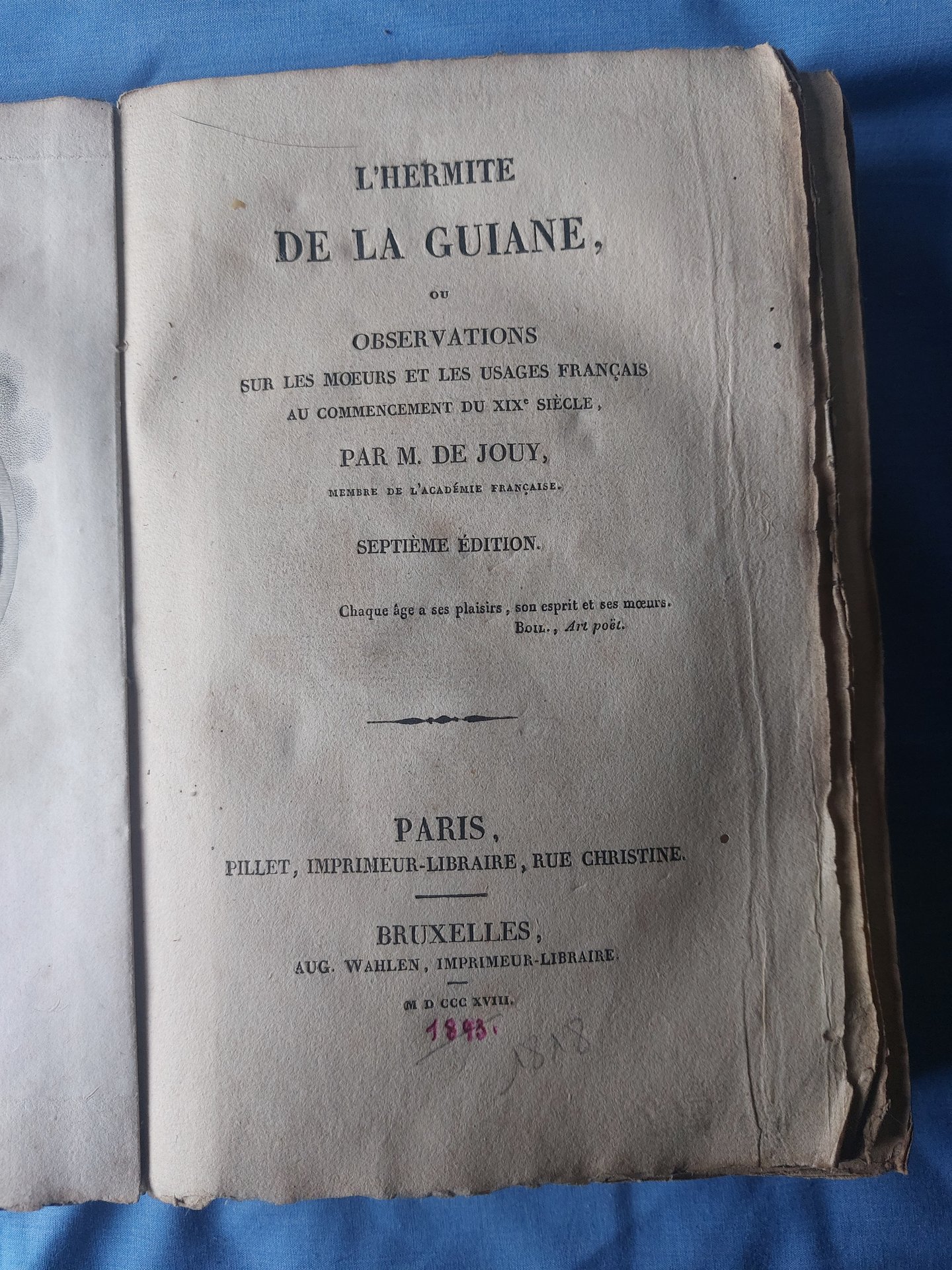 L'Hermite de la Guyane ou Observations sur les mœurs et les usages français au commencement du XIXe siècle est une œuvre de l’écrivain et dramaturge Étienne de Jouy, publiée en 1825. Ce texte s'inscrit dans la série des Hermites, dans laquelle Jouy adopte une perspective critique et satirique sur la société de son époque. À travers les observations d’un personnage fictif exilé en Guyane, l’auteur dresse un portrait des mœurs françaises du début du XIXe siècle, mêlant réflexions morales, anecdotes et descriptions sociales. Fidèle à son style, Jouy y allie ironie et critique subtile pour mettre en lumière les travers de la société post-révolutionnaire. 1818 date incertaine puisqu'il s'agit d'une édition pirate