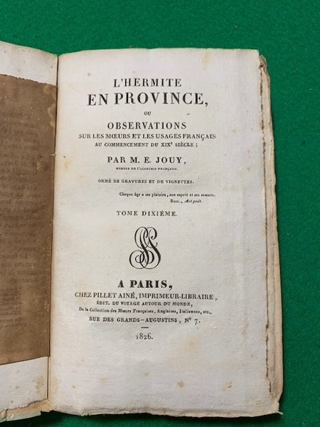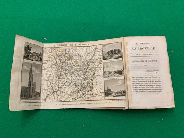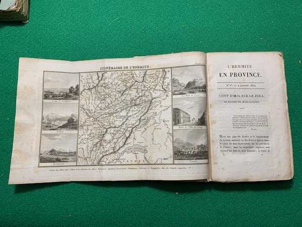 In 8° (18x11 cm); (4), (1 mezza pagina con avviso dell'editore), 290, (6) pp. e due c. di tav. una delle quale più volte ripiegata con con cartina dei dintorni di Bresancon e vedute di diversi monumenti. Brossure editoriali azzurre con titolo e vignetta, impressa in nero al piatto anteriore di ogni volume. Bell'edizione, illustrata, di questo classico racconto di viaggio a due mani, composto dal drammaturgo francese, Victor-Joseph Étienne, called de Jouy (19 October 1764 - 4 September 1846), a lui si deve il libretto dell'opera "La Vestale" di Spontini e dallo scrittore francese, Jay Adolphe Francois Marie. Varie piccole fini incisioni nel testo. Qualche minimo foxing dovuto alla qualità della carta utilizzata e nel complesso esemplare in buone-ottime condizioni di conservazione e completo delle brossure editoriali. Capitoli dedicati a: Coup-d'oeil sur le Jura; La Maison de Jean-Jaques; lons-Le-Saulnier; Besancon; Gray le Chateau de Beaujeu Non comune. Rif. Bibl.: Barbier II, 619.
