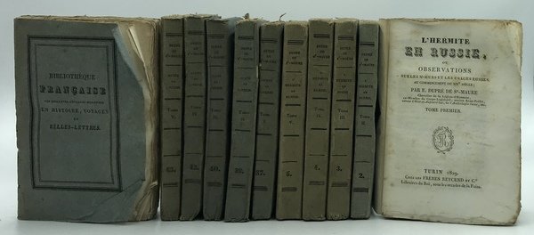 L'Hermite: Cinque volumetti in brossura editoriale a stampa (opera completa), 24mo cm9.5x14, pp 204, 200, 203 (1), 196, 203 (1). Volumi 1, 2, 3, 4 e 5 della Bibliothèque Française des meilleures ouvrages modernes en histoire, voyages et belles-lettres dei Fratelli Reycend.Pétersbourg: Sei volumetti in brossura editoriale a stampa (opera completa), 24mo cm9.5x14, pp 175 (1), 206 (2), 183 (1), 180, 172, 167 (1). Volumi 37, 39, 40, 41, 42, 43, 44 della collana (la numerazione nella collana salta un numero ma i volumi dell'opera ci sono tutti, forse un errore tipografico sul dorso?).