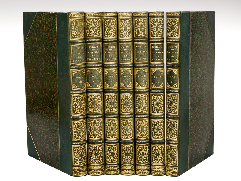 Exemplaire sur papier de chine, 7 vol. in-4 reliure demi-maroquin à coins vert, dos à 5 nerfs richement orné, filet doré en mors et coins, tête doré, couvertures et dos conservés, reliure signée de David, Librairie Hachette et Cie, Paris, 1872-1876 et 1878-1879, Rappel du titre complet : L'Histoire de France depuis les Temps les plus reculés jusqu'en 1789 racontée à mes petits-enfants (5 Tomes - Complet) [ Suivi de : ] L'Histoire de France depuis 1789 jusqu'en 1848 racontée à mes petits-enfants par M. Guizot, leçons recueillies par Madame de Witt, née Guizot, (2 Tomes - Complet) Magnifique exemplaire du rare tirage sur papier de chine, parfaitement relié par David. On joint une lettre autographe signée de Guizot, en date du 25 mars 1839, adressée à Auguste Séguier : "Je lirai avec grand plaisir, Monsieur, l'ouvrage que vous m'annoncez. Je sais avec quelle fermeté d'esprit vous jugez les situations sociales. Je ne craindrai jamais de voir mon nom revenir souvent sous votre plume. Je ne connais rien de plus agréable que d'être compris. Recevez, je vous prie [. ]". François Guizot évoque ici la brochure d'Auguste Séguier, intitulée : "Monsieur Guizot et la Révolution de Juillet", qui paraîtra dans le courant de l'année 1839. Superbe exemplaire, dans le premier tirage des nombreuses illustrations par Alphonse de Neuville, Philippoteaux, Emile Bayard, Sahib, etc., provenant de la bibliothèque du dramaturge, directeur de théâtre et bibliophile Paul Gavault (avec son ex-libris, infimes usures et frott. en reliure et coupes, parfait état par ailleurs). Vicaire, III, 1177