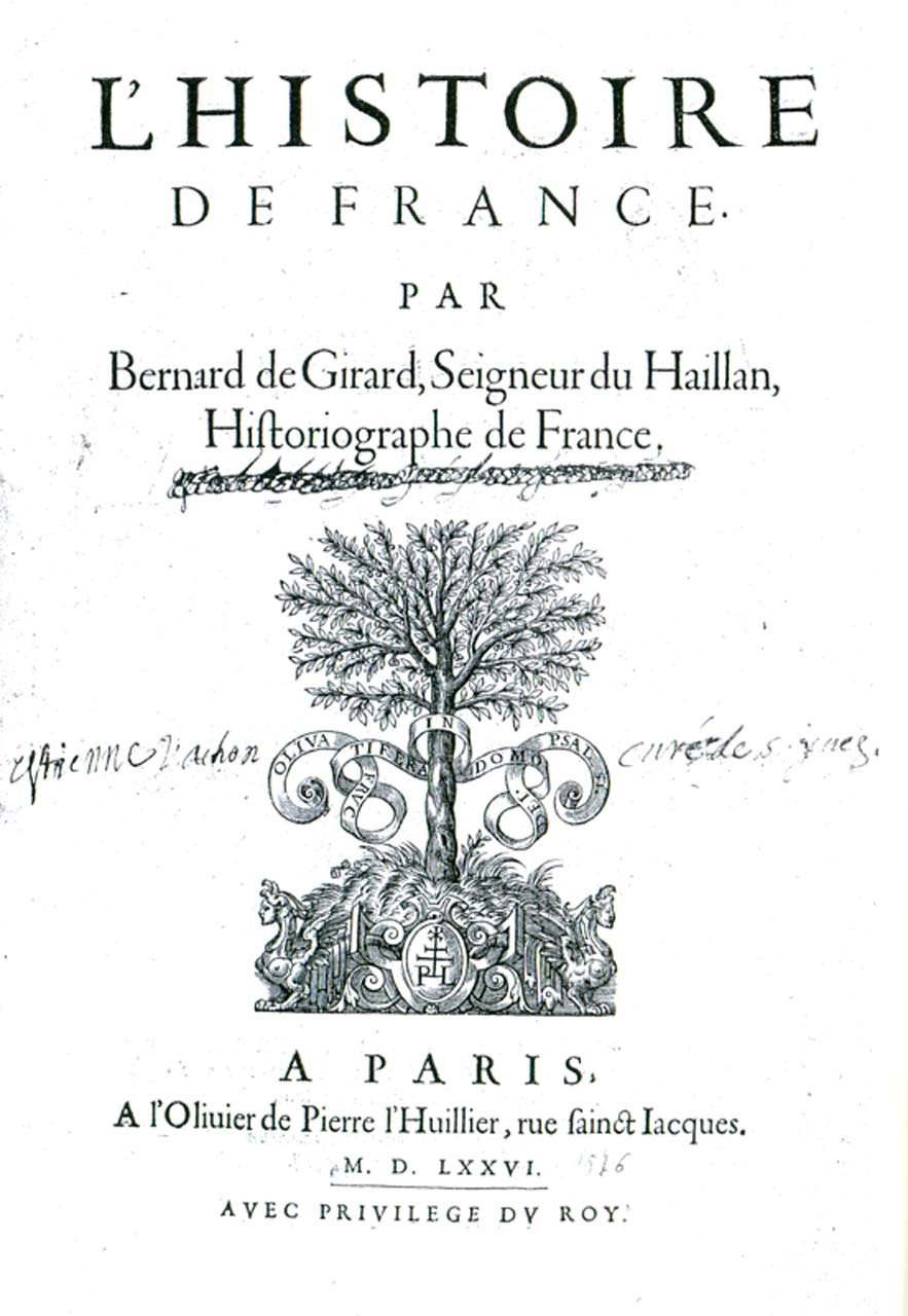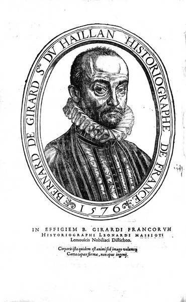 In-4 gr. (mm. 362x228), p. pergam. antica (restaur. per manc.), dorso a cordoni con titolo ms., 20 cc.nn., 1302 pp.num., 35 cc.nn., marca tipografica al frontesp. e al fine inc. su legno, ritratto dell'A. in medaglione (xilografato al verso del frontesp.), ornato da elaborate testat. e grandi iniziali a vignetta, pure inc. su legno. Storia dei 53 re di Francia da "Pharamond premier Roy des Francons, Francs, ou François, à Charles VII fils de Charles sixième". "Prima edizione", rara.<br>Cfr. Brunet,II,1612 - Adams,I,732 - Biographie Universelle,XIX,316: "L'ouvrage de Bernard de Girard, seigneur de Haillan (1535-1610) est remarquable en ce que c'est le premier corps d'histoire de France qui ait paru dans notre langue". Con uniformi arross. più o meno pesanti, fiorit. e lievi aloni margin.; frontesp. restaur. per fori di tarlo, ma complessivam. esemplare in buono stato di conservazione.