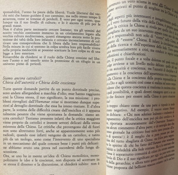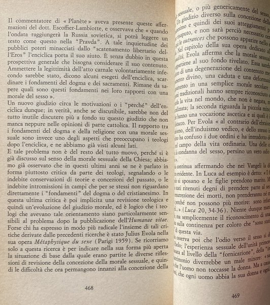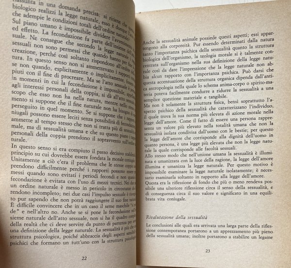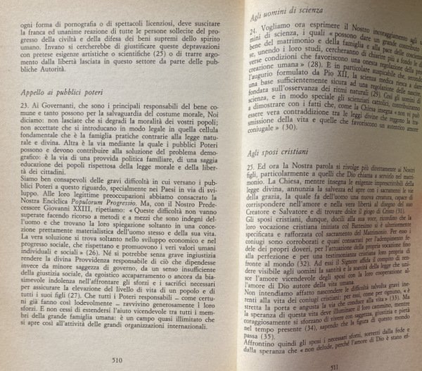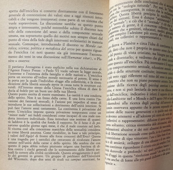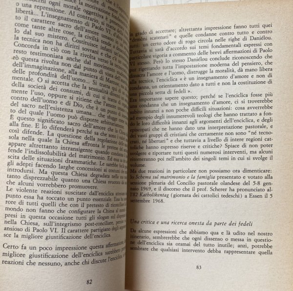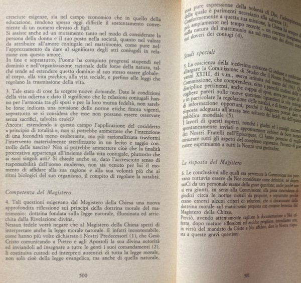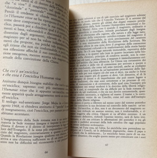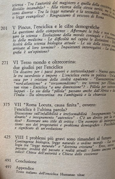 Soggetti: Bioetica, Filosofia, Cattolicesimo, Chiesa, Teologia, Religione, Cristianesimo, Dogmatica, Inchieste, Reportage, Documenti pontifici, Papa Paolo VI, Fertilità, Fecondazione assistita artificiale, Sterilizzazione, Enciclica Humanae vitae, Encicliche, Storia, Nascite, Controllo, Concezione cattolica, Etica, Morale, Vita umana, Aborto, Neonati, Feto, Natalità, Paulus VI, Rispetto, Morale sessuale, Sessualità, Matrimonio, Coniugi, Procreazione, Evangelium vitae, Conferenze episcopali, Diritto canonico, Controversie religiose, Continenza, Peccato, Vincoli, Dokumentation wichtiger Stellungnahmen zur umstrittenen Enzyklika über die Geburtenkontrolle, Commenti, Problematiche, Reazioni internazionali, Conferenze, Infallibilità papale, Risanamento dottrinale, Concilio, Questioni, Responsabilità, Pillola, Scienza, Famiglia, Fecondità, Fede, Fedeli, Posizioni, Magistero, Donna, Donne, Natura, Paesi cattolici, Stato, Laicismo, Potere, Separazione, Vita coniugale, Conscia paternitas, Maternità, Giudizio, Peccato, Franzelin, Legge, Bibbia, Provvidenza, Movimento studentesco, Sessantotto, Manifestazioni, Giovani, Contestazione, Rivoluzione sessuale, Costumi, Libertà, Libero arbitrio, Papa Montini, Maggio 1968, Persona umana, Significato, Corpo, Creazione, Autonomia, Coscienza, Autorità, Visioni differenti, Dio, Amore coniugale, Rinuncia, Egoismo, Antiabortisti, Mentalità anti-natalista, Consumismo, Giovanni Paolo, Discorsi, Vaticano, Acta Apostolicae Sedis, Lettere, Gaudium et spes, Vizi capitali, Insegnamenti, Cristo, Dignità, Esortazione apostolica, Ecumenismo, Pincus, Demografia, Cifre demografiche, Terzo Mondo, Roma locuta, causa finita, Contraccezione, Amore, Fedeltà, Purezza, Legge naturale, Castità, Verginità, Valori morali, Crisi, Vocazione, Autoritarismo, Restaurazione, Paternità, Atti coniugali, Ingerenza, Anticoncilio, Ecclesiastici, Clero, Papi, Parola, Linguaggio, Comunità, Società civile, Biologia, Opinioni, Sottosviluppo, Sacerdozio, Impero, Eurocentrismo, Africa, Nord atlantismo, Asia, India, America Latina, Eros, Sesso, Politica, Accuse, Critica, Progestativi, Irriformabilità, Libri Vintage fuori catalogo, Riferimento, Bibliografia, Brasile, Italia, Cile, Argentina, Balcani, Jugoslavia, Anni Sessanta, Olanda, Polonia, Scandinavia, Spagna, Stati Uniti, Indagini, Bolle papali, Discussioni, Comportamenti leciti, Mezzi terapeutici, Malattie, Organismo, Procreazione, Periodi infecondi, Intimazioni precettive, Onan, Sacri testi, Convenienza, Pio XI, Pio XII, Infedeltà coniugale, Moralità, Dottrina, Minoranza conservatrice, Pontificia Commissione, Studio della famiglia, Limitazione delle nascite, Casti connubi, Lambeth, Chiesa anglicana, Ambrogio Valsecchi, Jean Guitton, Piacere, Albino Luciani, 25 luglio 1968, Huftier, Lumen Gentium, Hanry Duquaire, Maximos IV, Luciana Castellina, Katholikentag, Martelet, Unam Sanctam, Dogmatica, Jorge Mejia, Ortodossia, Patriarchi, Vescovi, Atenagoras, Julius Evola, Metafisica, Stampa, Giornalisti, Documentazione sulla Chiesa Contemporanea, Bioethics, Philosophy, Catholicism, Church, Theology, Religion, Christianity, Dogmatics, Investigations, Reportage, Pontifical Documents, Pope Paul VI, Fertility, Assisted Artificial Insemination, Sterilization, Encyclical, Encyclicals, History, Birth Control, Catholic Conception, Ethics, Human life, Abortion, Newborns, Fetus, Natality, Respect, Sexual morality, Sexuality, Marriage, Spouses, Procreation, Episcopal conferences, Canon law, Religious controversies, Continence, Sin, Constraints, Comments, Problems, International reactions, Conferences, Papal infallibility, Doctrinal reform, Council, Issues, Responsibility, Pill, Science, Family, Fertility, Faithful, Positions, Magisterium, Woman, Women, Nature, Catholic countries, State, Laicism, Power, Separation, Conjugal life, Maternity, Judgment, Sin, Law, Bible, Providence, Student movement, Sixty-eight, Demonstrations, Young people, Protest, Sexual revolution, Customs, Freedom, Free will, May '68, Human person, Meaning, Body, Creation, Autonomy, Consciousness, Authority, Different visions, God, Conjugal love, Renunciation, Selfishness, Anti-abortionists, Anti-natalist mentality, Consumerism, John Paul, Speeches, Vatican, Letters, Capital sins, Teachings, Christ, Dignity, Apostolic Exhortation, Ecumenism, Pincus, Demography, Demographic figures, Third World, Roma locuta, cause finite, Contraception, Love, Fidelity, Purity, Natural law, Chastity, Virginity, Moral values, Crisis, Vocation, Authoritarianism, Restoration, Fatherhood, Conjugal acts, Interference, Anti-council, Ecclesiastics, Clergy, Popes, Speech, Language, Community, Civil society, Biology, Opinions, Underdevelopment, Priesthood, Empire, Eurocentrism, North Atlanticism, Sex, Politics, Accusations, Criticism, Progestatives, Unreformability, Out-of-print books, Reference, Bibliography, Brazil, Italy, Chile, Balkans, Yugoslavia, Sixties, Holland, Poland, Spain, United States, Investigations, Papal Bulls, Discussions, Lawful Behavior, Therapeutic Means, Diseases, Organism, Procreation, Infertile Periods, Preceptive Intimations, Sacred Texts, Convenience, Pius XI, XII, Conjugal Infidelity, Morality, Doctrine, Conservative Minority, Pontifical Commission, Study, Family, Birth limitation, Anglican Church, Pleasure, Dogmatics, Orthodoxy, Patriarchs, Bishops, Metaphysics, Press, Journalists, Documentation, Contemporary Church