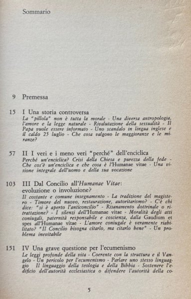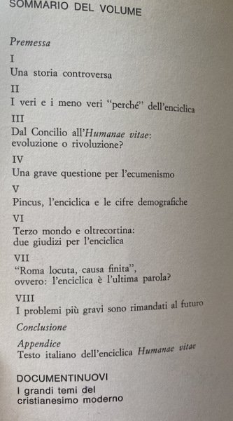 La presente inchiesta, condotta su materiale informativo e studi provenienti da numerosi paesi cattolici e non cattolici del mondo occidentale, del mondo socialista e del Terzo mondo, offre la più completa e aggiornata documentazione e l'esame più approfondito sinora pubblicati in Italia e all'estero sull'enciclica Humanae vitae di papa Paolo VI.