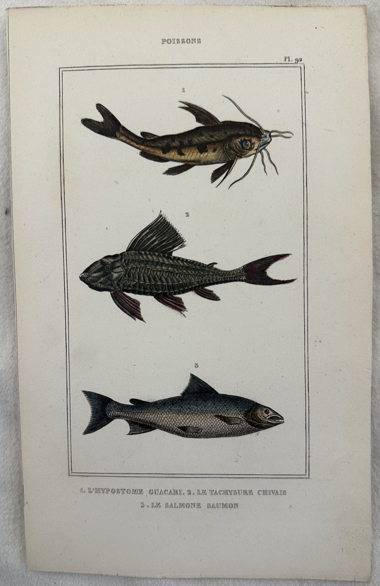 Bella incisione colorata a mano del 1850 circa tratta dalla monumentale opera di storia naturale di Buffon, carta spessa. L'incisione rappresenta due specie di pesce gatto, un salmone.<BR>In buone condizioni, fioriture.TECNICA: Incisione DIMENSIONI FOGLIO: cm 22x14 DIMENSIONI INCISIONE: cm 15,5x9 EPOCA: 1850 circa Buffon fu un'esponente del movimento scientifico legato all'illuminismo e le sue teorie influenzarono le generazioni successive di naturalisti in particolare Jean Baptiste Lamarck e Charles Darwin.<BR>Questa è la sua opera più celebre ed è l'"Histoire Naturelle" pubblicata per la prima volta tra il 1749 ed il 1789 in 36 volumi di cui 8 postumi grazie al lavoro di Bernard Lacepede. Buffon espone tutto il sapere dell'epoca nel campo delle scienze naturali e proprio in questo scritto rilevò le somiglianze tra l'uomo e la scimmia e la possibilità di una genealogia comune.Nice engraving colourd by habd of 1850 circa taken from the monumental work of natural history by Buffon, wide paper.<BR>The engraving represents two species of catfishes and one salmon<BR>In good conditions, foxing TECHNIQUE: Print LEAF SIZE: cm 22x14 PRINT'S SIZE: cm 15,5x9 PERIOD: 1850 circa Buffon was an exponent of the scientific movement connected to illuminism and his theories inspired the next generations of naturalists in particular Jean Baptiste Lamarck and Charles Darwin.<BR>His most famous work is l'"Histoire Naturelle" published for the first time between 1749 and 1789 in 36 volumes of which 8 are posthumous thanks to the work of Bernard Lacepede. Buffon exposes in the work all the notions in natural history and in this writing in particular underlined the similarity between monkeys and man with a possibility of common genealogy.