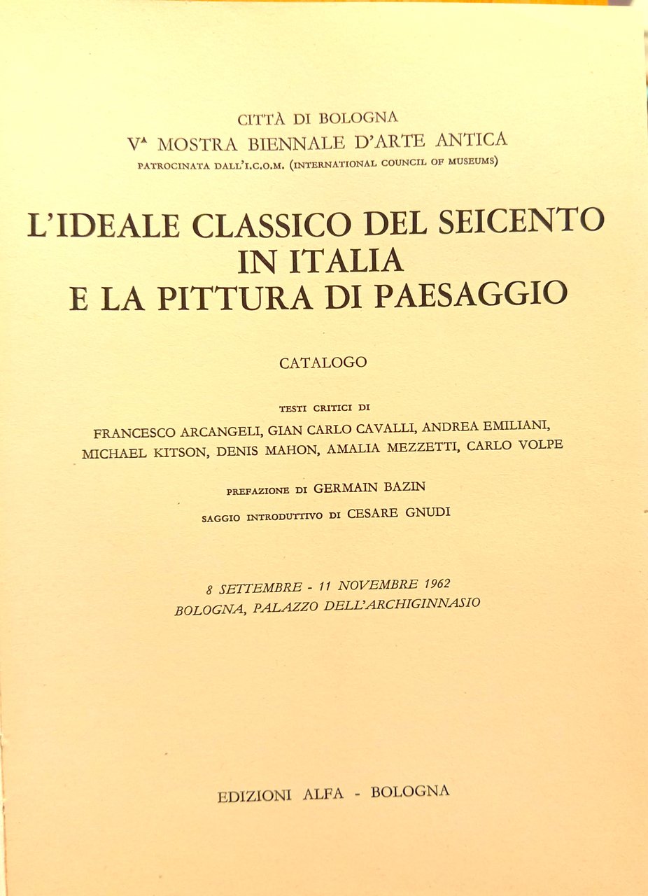 I ed. del catalogo della Vª Mostra Biennale d'Arte Antica tenutasi presso il Palazzo dell'Archiginnasio di Bologna dall'8 settembre all'11 novembre 1962 e patrocinata dall'I.C.O.M. (International Council of Museums). Indice generale: Comitati - Prestatori e Collaboratori - Prefazione; di Germain Bazin (in francese) - Saggio Introduttivo; di Cesare Gnudi - Ringraziamento - Tavole fuori testo (8 riproduzioni fotografiche in b/n - Annibale Carracci; di Gian Carlo Cavalli - Domenico Zampieri detto il Domenichino; di Gian Carlo Cavalli - Francesco Albani; di Carlo Volpe - Nicolas Poussin; di Denis Mahon - Claude Lorrain; di Michael Kitson - Gaspard Dughet; di Francesco Arcangeli - Momenti del Classicismo a Roma (G.Reni-A. Elsheimer-G.B. Viola-G. Lanfranco-P. Bril-A. Tassi-P. da Cortona-A. Sacchi-P.F. Mola-G.F. Romanelli-G.F. Grimaldi); di Andrea Emiliani - Alessandro Algardi; di Amalia Mezzetti - François Du Quesnoy; di Amalia Mezzetti - Indice dei luoghi e delle opere - Tavole (228 riproduzioni fotografiche in b/n f. t.). In-8, pp. XVIII+458+8 nn., fra cui alcune pubblicitarie in b/n, bross. ill. a coll. (Nicolas Poussin, Paesaggio con Orfeo ed Euridice", Parigi, Musée du Louvre). Stato buono (leggero stato d'uso della sovracc. ai margini)"