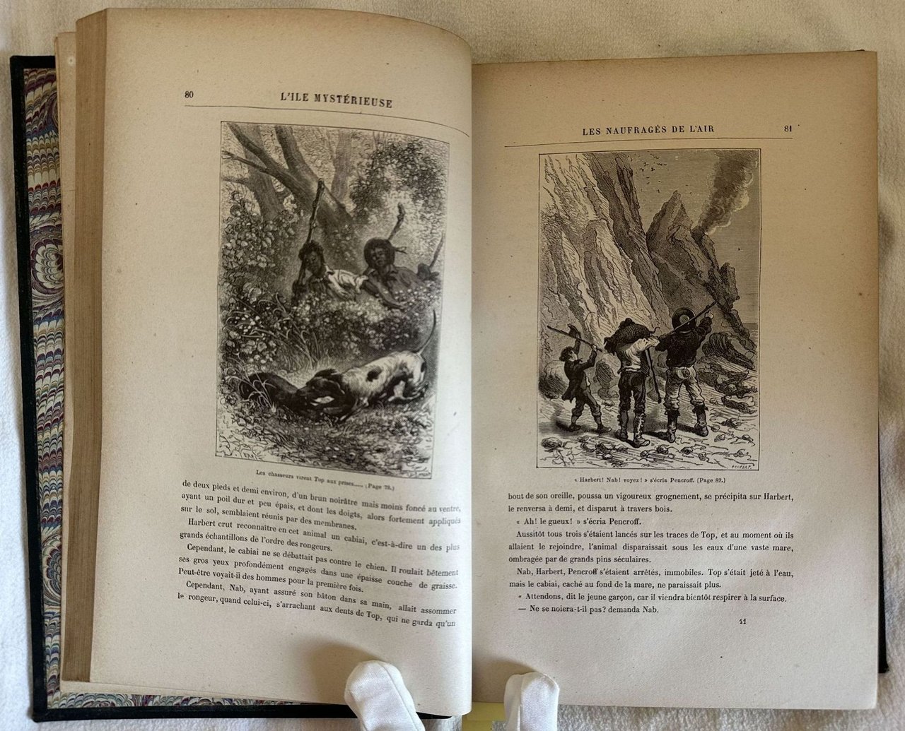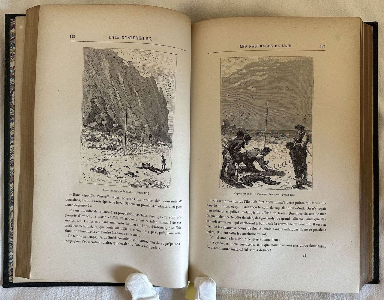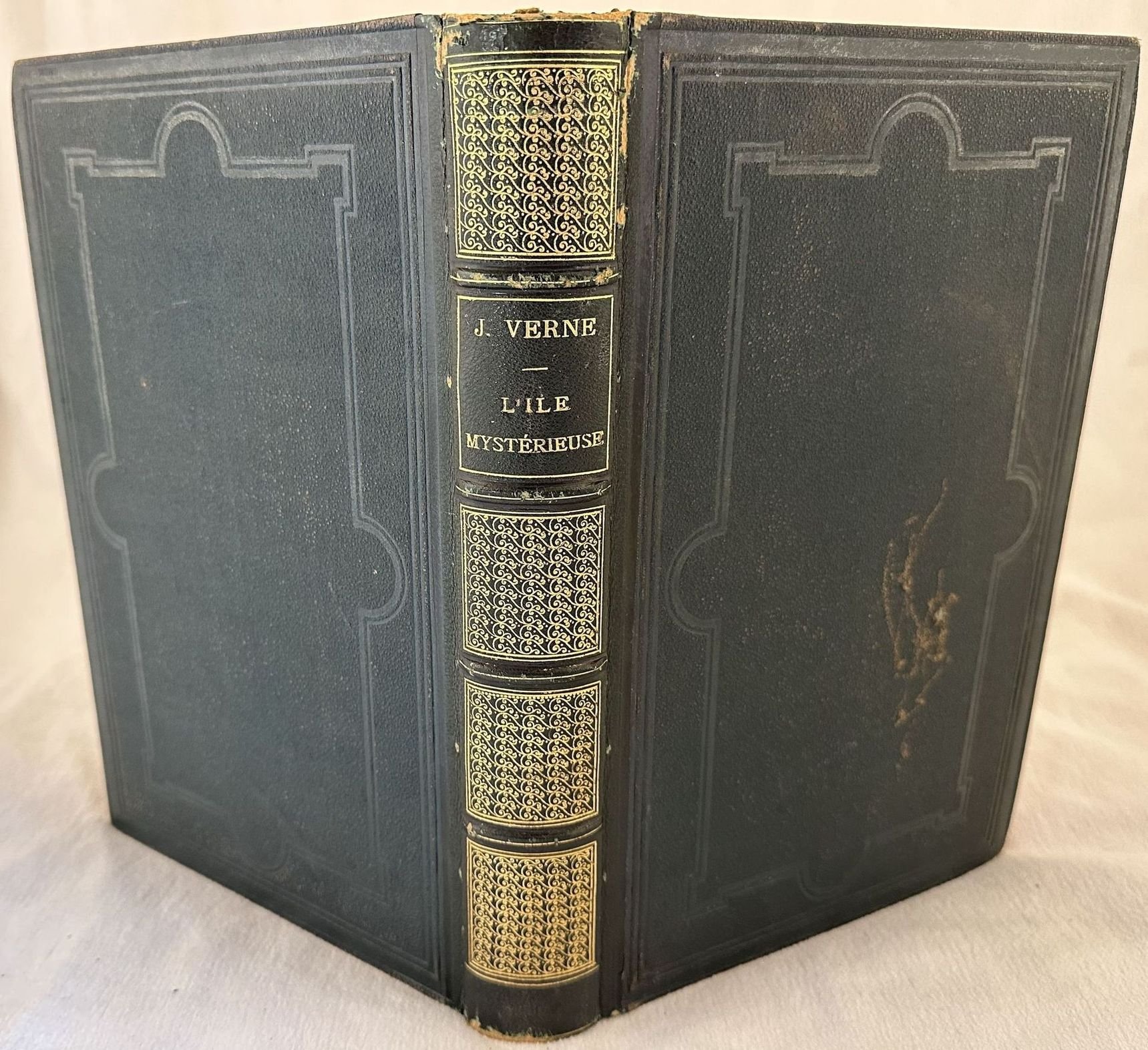 Edizione di fine ottocento del noto romanzo di avventura dello scrittore Jules Verne (1828-1905). L'opera venne pubblicato per la prima volta a puntate nel 1875 e tradotto in italiano lo stesso anno. Numerose illustrazioni nel testo incise da Barbant su disegni di Ferat e mappe nel testo. Antiporta illustrata. Bellissima legatura firmata "Garibel". Tagli dorati. In ottime condizioni. Copertina in mezza pelle con titolo e ricche decorazioni in oro al dorso in ottime condizioni generali con lievi usure ai margini e dorso. Legatura in buone condizioni. All'interno le pagine si presentano in buone condizioni con rare fioriture. In 4. Dim. 27,5x19 cm. Pp. (4)+616. Edition of late 19th century of the famous novel of adevnture by the writer Jules Verne (1828-1905). The work was published for the first time in instalments in 1875 and translated into italian language the same year. Different illustrations in the text engraved by Barbani after Ferat and maps ion the text. Illustrated frontspice. Very beautiful binding signed "Garibel". Gilted fore edges. In very good conditions. Half leather cover with gilted title and rich decorations in the spine in very good general conditions lightly worn in the edges and spine. Binding in good conditions. Pages in good conditions with occasional foxing.In 4. Dim. 27,5x19 cm. Pp. (4)+616.