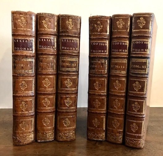 12mo (cm. 16,5), 6 Voll., 5 cc.nn., XCII, 266 (i.e. 300) pp., 1 c.nn., 389(3) pp., 1 c.nn., 382 pp.; CXXIII(I)-299(1) pp., 1 c.nn., 348 pp., 1 c.nn., 333(3) pp. Con una graziosa testatina calcografica nel primo volume dell’Iliade e 55 tavv. f.t. incise su rame (di cui una ripiegata ed una in antiporta di ciascun volume). Iniziali e fregi xilografici n.t. Legature coeve in piena pelle con nervi, fregi e titoli oro su tassello al ds. (minime tracce d’usura e piccole mancanze alle cuffie). Tagli rossi. Carte di guardia marmorizzate. Ex libris di collezione privata ai contropiatti anteriori. Lievi, occasionali arrossature, peraltro esemplare in ottimo stato di conservazione. Assente il settimo volume di ‘Supplemento’ contenente la Vita di Omero scritta dalla stessa Madame Dacier ed una Dissertazione sulla durata dell’assedio di Troia dell’abate Banier. Opera rara.